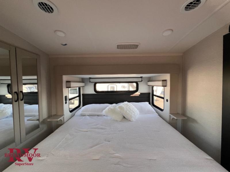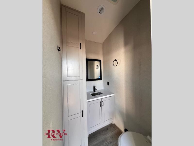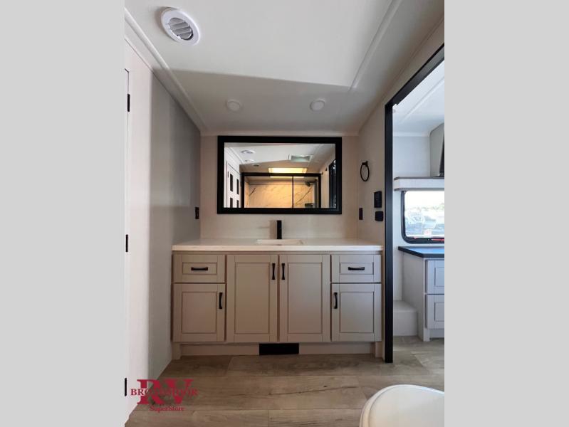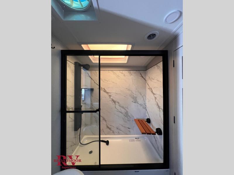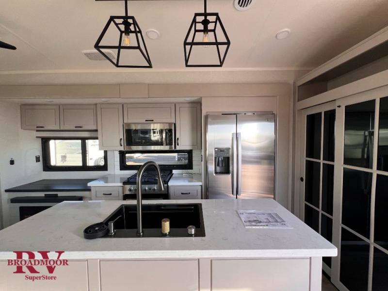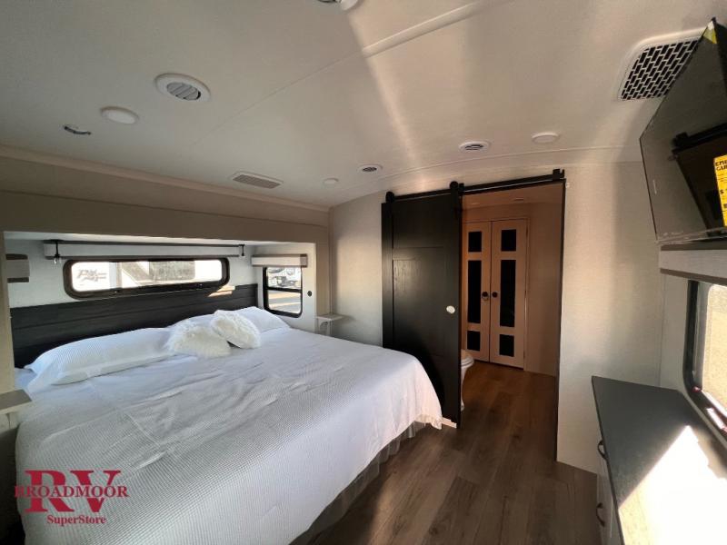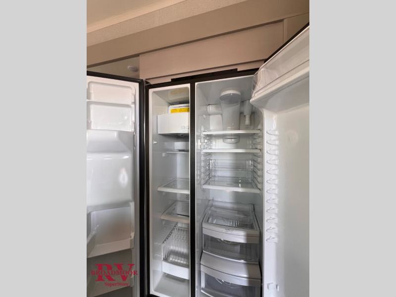 Finding the perfect RV park or campground is all you have to do, then you can load up and hit the road whether you are a full-timer or weekend warrior. The two electric awnings and the three slides are easy to set up and close, and you will have lots of interior and exterior storage to bring everything you might need. The kitchen offers a residential refrigerator and 24" stove, a 30" residential microwave, a kitchen island, a pantry and a pull-out countertop. You can relax on the tri-fold sofa and the theater seats while watching your shows on the 50" Smart LED HDTV with fully digital HDMI output and home entertainment system with subwoofer plus there is a fireplace below. Dine at the roll-top dinette table, or you can work from here as well. The front bedroom offers a king bed slide and a flip-top dresser with 32" TV, plus access to a spacious private front bath including a walk-in closet, washer/dryer prep, and more.