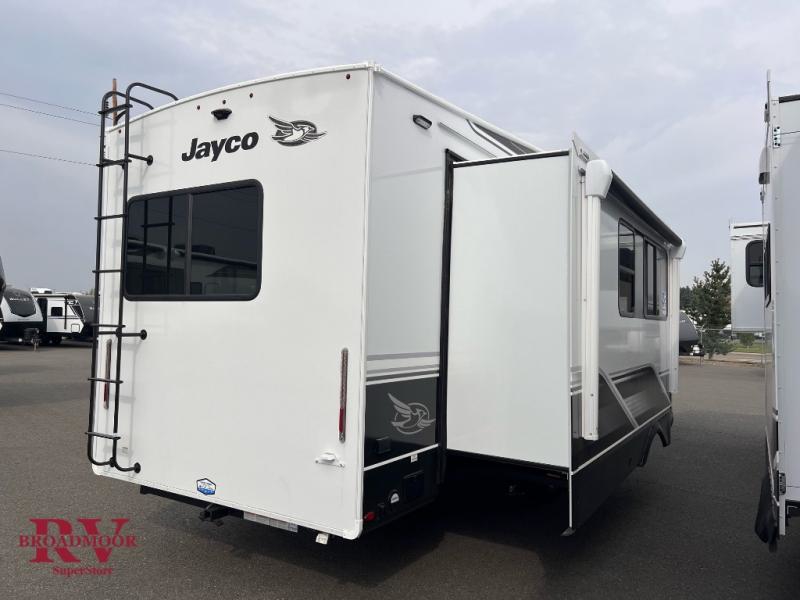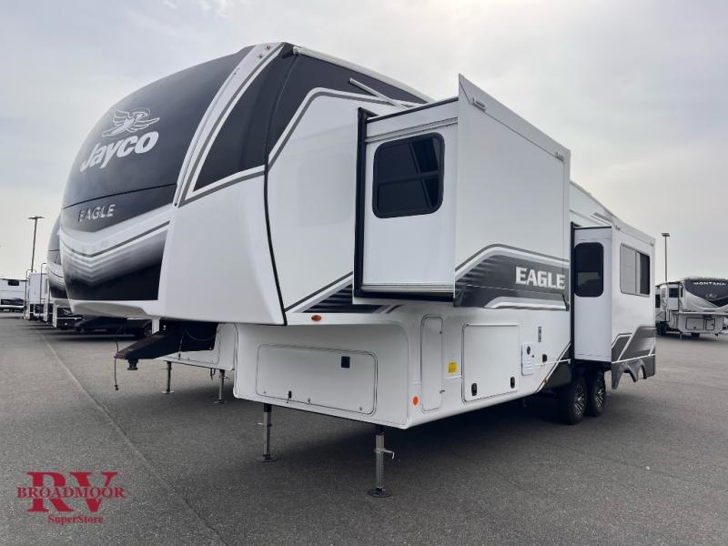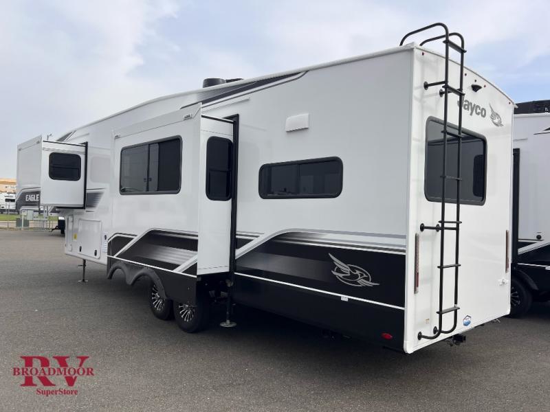 With any Eagle fifth wheel by Jayco you will appreciate durable construction materials, like the Magnum Truss Roof and the Stronghold VBL laminated walls. The JAYCOMMAND Smart RV system puts you in control of your RV's functions, and the 5 Star Handling Package will provide smooth towing from home to camp. Each model features Climate Shield zero-degree tested weather protection and the industry-exclusive HELIX cooling system that features two 15,000 BTU Whisper Quiet A/C's to keep you comfortable year around. Some of the exterior conveniences you are sure to love are the pass-through storage with Slam-Latch baggage doors and an automotive style front cap with max turn radius. The Eagle fifth wheels are designed to make you feel at home with solid hardwood slide fascia, residential vinyl flooring throughout, 100% no floor vents, and blackout roller shades with reflective side throughout for added privacy and insulation.