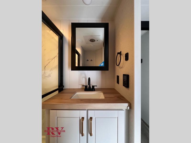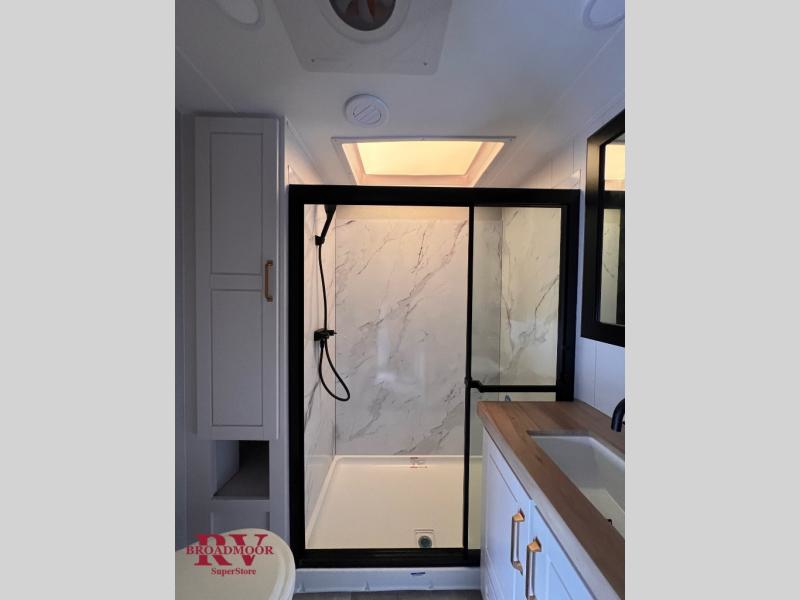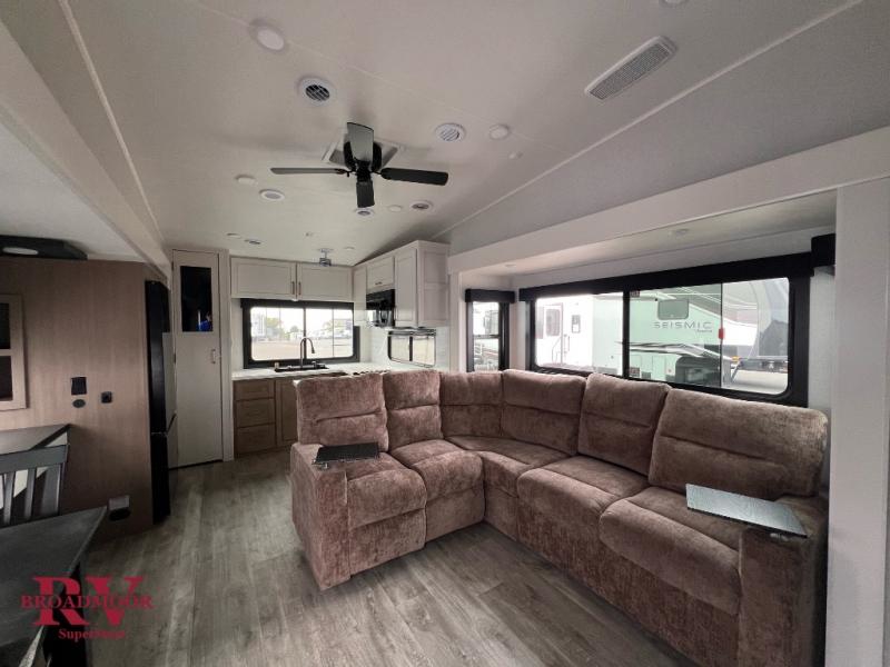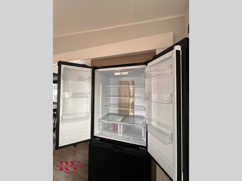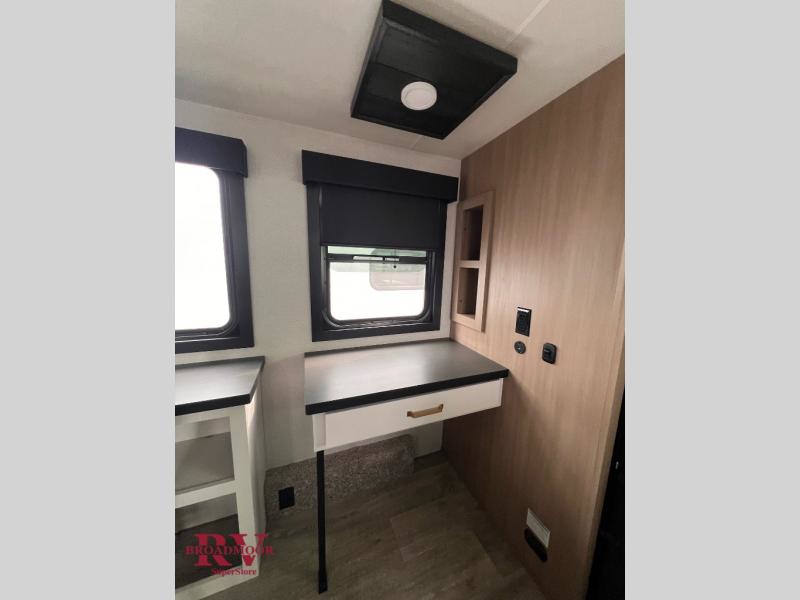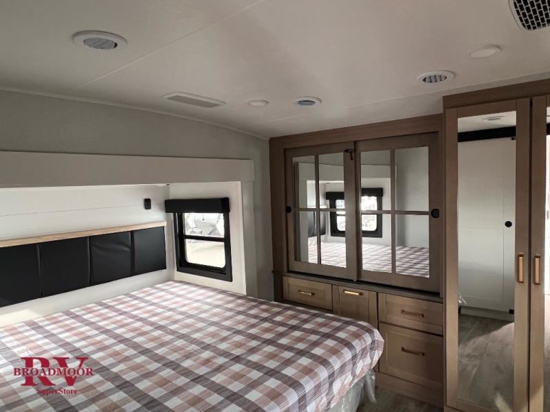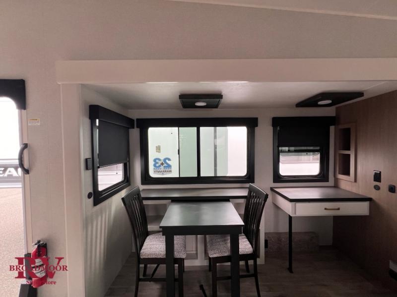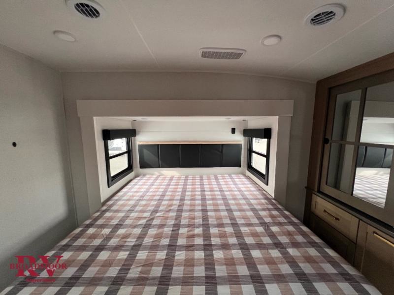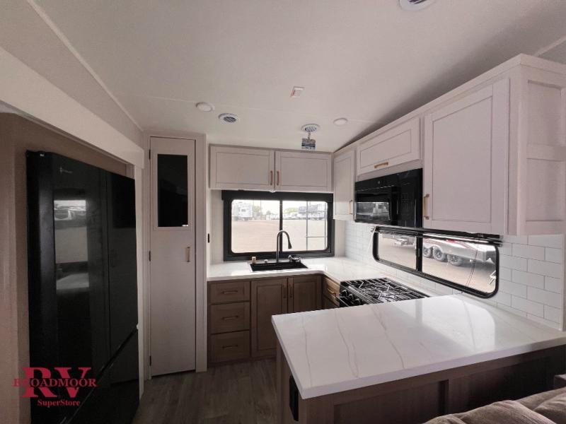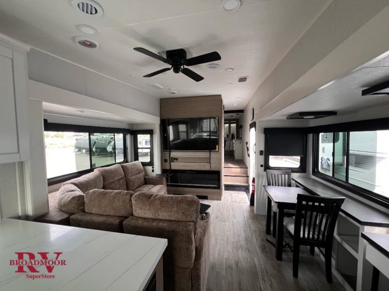 It will be so easy to enjoy time in this spacious fifth wheel! The chef of your group is sure to love the rear kitchen with a U-shaped counter and plenty of storage for food and dishes. The middle living area includes an entertainment center with a fireplace across from the L-shaped sofa for movie nights. There is also a desk to get some work done and a roll-top dinette with two chairs to dine at. Heading up front, you'll find the spacious bathroom that includes a shower with a seat, and the front private bedroom with a king bed slide out. There is also a chest with a TV, front shelves with drawers, plus washer and dryer prep!