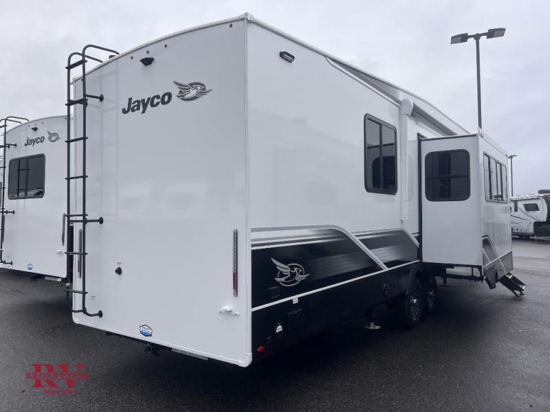 With any Eagle fifth wheel by Jayco you will appreciate durable construction materials, like the Magnum Truss Roof and the Stronghold VBL laminated walls. The JAYCOMMAND Smart RV system puts you in control of your RV's functions, and the 4 Star Handling Package will provide smooth towing from home to camp. Each model features Climate Shield zero-degree tested weather protection and the industry-exclusive HELIX cooling system that features two 15,000 BTU Whisper Quiet A/C's to keep you comfortable during those colder months. Some of the exterior conveniences you are sure to love are the pass-through storage with Slam-Latch baggage doors and an automotive style front cap with max turn radius. The Eagle fifth wheels are designed to make you feel at home with solid surface countertops, residential vinyl flooring throughout, 100% no floor vents, and blackout roller shades with reflective side throughout for added privacy and insulation.