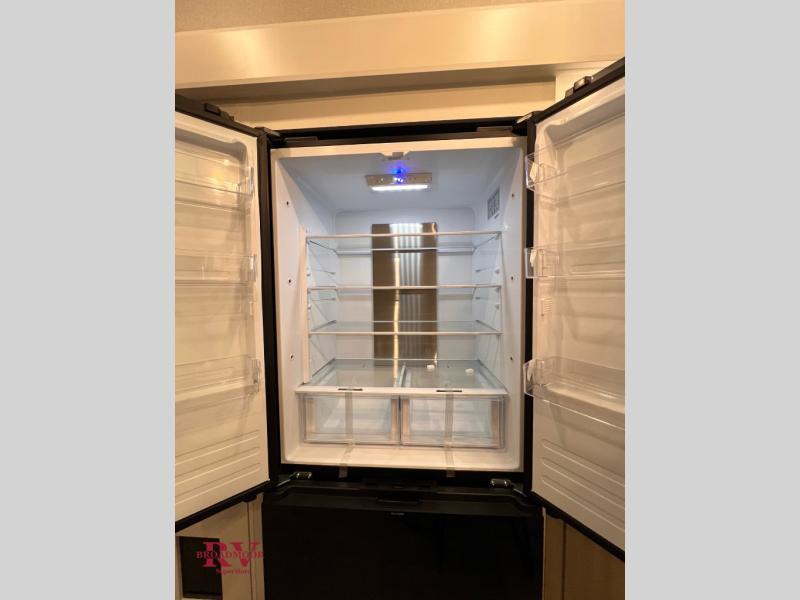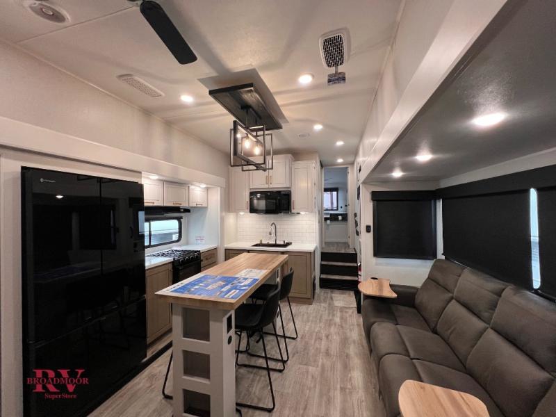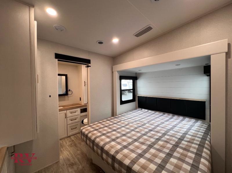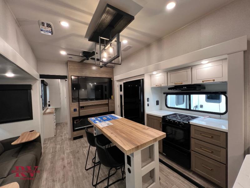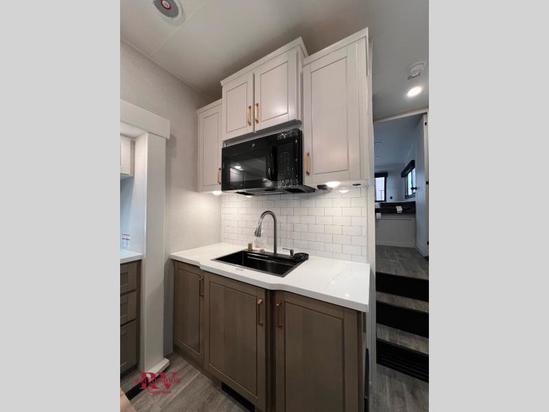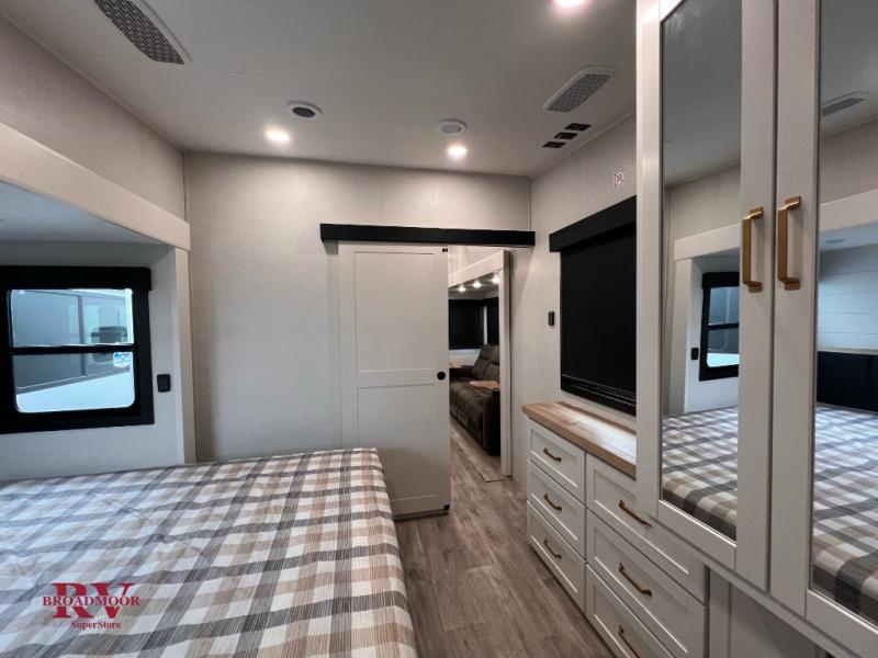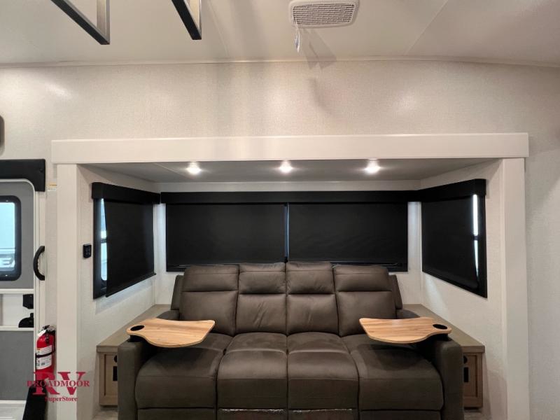At the front of the unit, you’ll find one of the two bedrooms, featuring dual 34" x 76" twin beds that easily convert into an expansive 92" x 76" sleeping area with a fold-down bed ideal for guests or family. This space also includes a fold-down desk for work or study, along with a wardrobe with washer/dryer prep. Just down the hall, a convenient half bath adds extra functionality for guests. In the middle, the living area and kitchen shine with dual opposing slide-outs that create an open, residential feel. One slide houses a spacious pantry, a 16 cu. ft. refrigerator, and a 21" range with edge-to-edge grates, complemented by abundant overhead cabinetry, while the adjacent area features a 30" over-the-range black and stainless microwave and sink. The central kitchen island dinette provides the perfect gathering spot for meals or game nights. Across the way, a 93" theater sofa with cup holders and end tables offers a cozy place to relax. At the rear, the second bedroom delivers true comfort with a 72" x 80" king bed, a wardrobe and dresser for storage, and a private full bathroom complete with generous counter space and a 30" x 48" shower—creating a luxurious retreat at the end of the day.