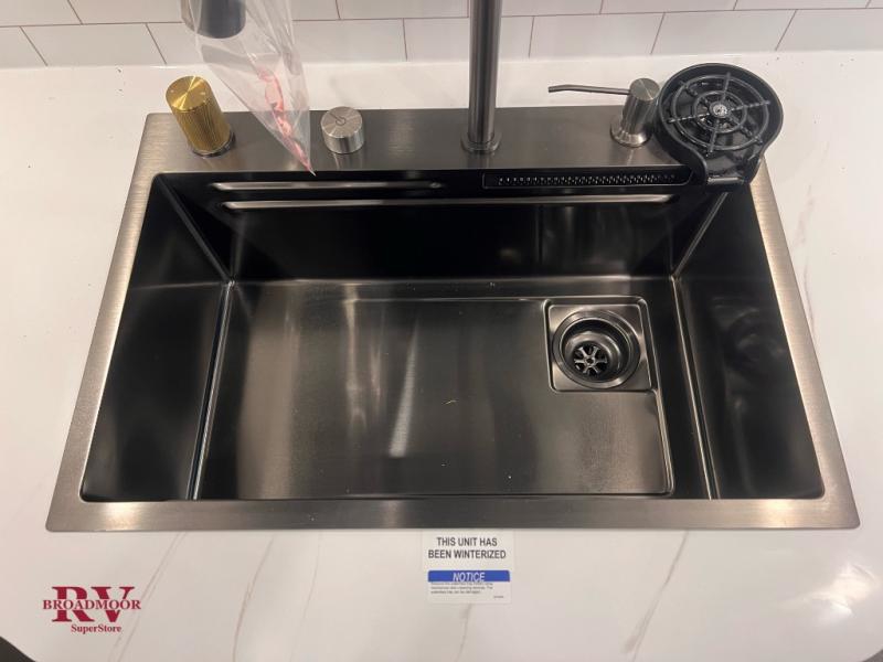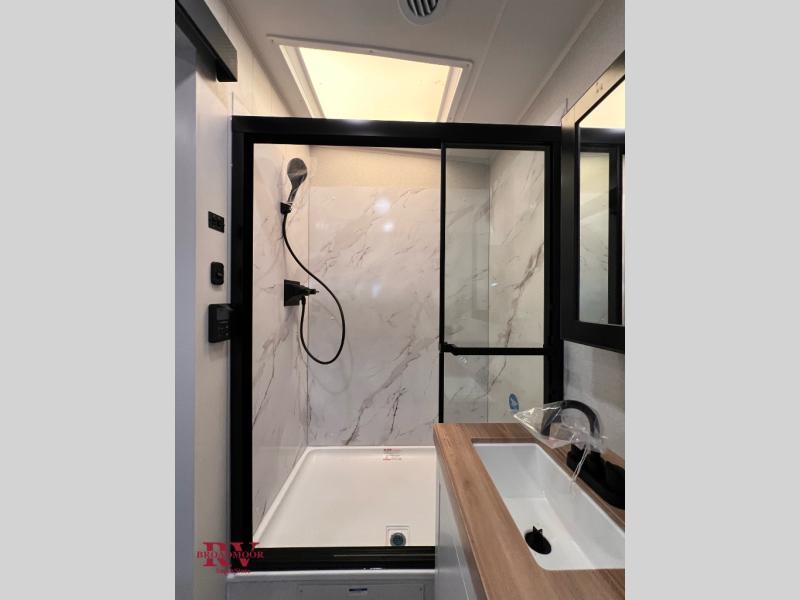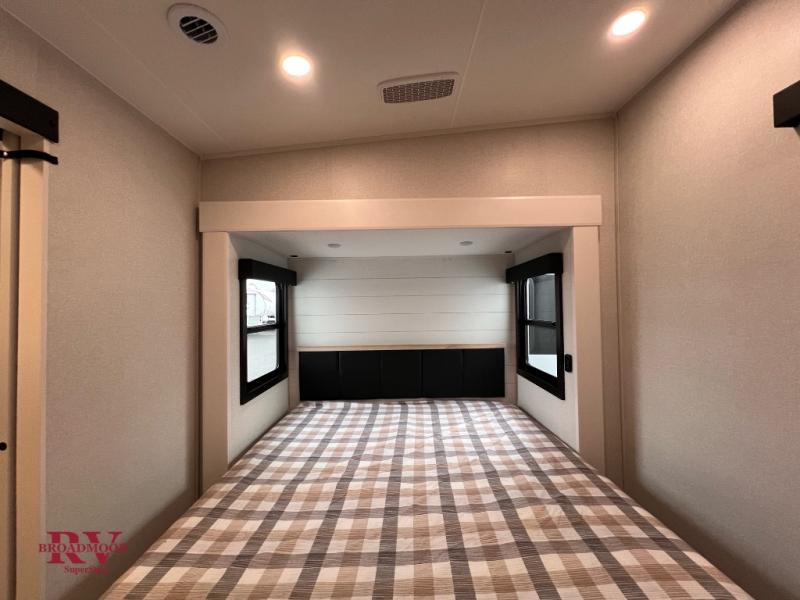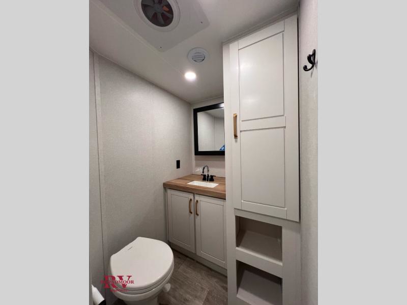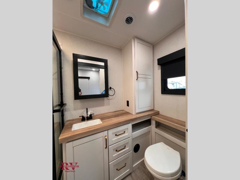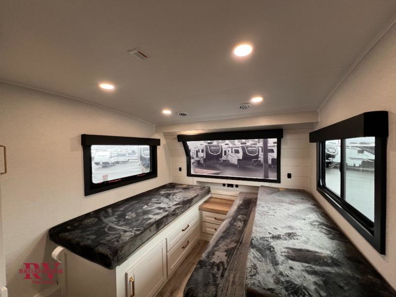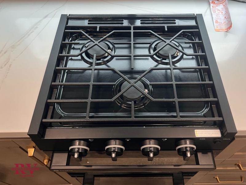 At the front of the unit, you’ll find one of the two bedrooms, featuring dual 34" x 76" twin beds that easily convert into an expansive 92" x 76" sleeping area with a fold-down bed ideal for guests or family. This space also includes a fold-down desk for work or study, along with a wardrobe with washer/dryer prep. Just down the hall, a convenient half bath adds extra functionality for guests. In the middle, the living area and kitchen shine with dual opposing slide-outs that create an open, residential feel. One slide houses a spacious pantry, a 16 cu. ft. refrigerator, and a 21" range with edge-to-edge grates, complemented by abundant overhead cabinetry, while the adjacent area features a 30" over-the-range black and stainless microwave and sink. The central kitchen island dinette provides the perfect gathering spot for meals or game nights. Across the way, a 93" theater sofa with cup holders and end tables offers a cozy place to relax. At the rear, the second bedroom delivers true comfort with a 72" x 80" king bed, a wardrobe and dresser for storage, and a private full bathroom complete with generous counter space and a 30" x 48" shower—creating a luxurious retreat at the end of the day.