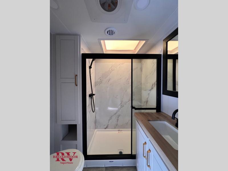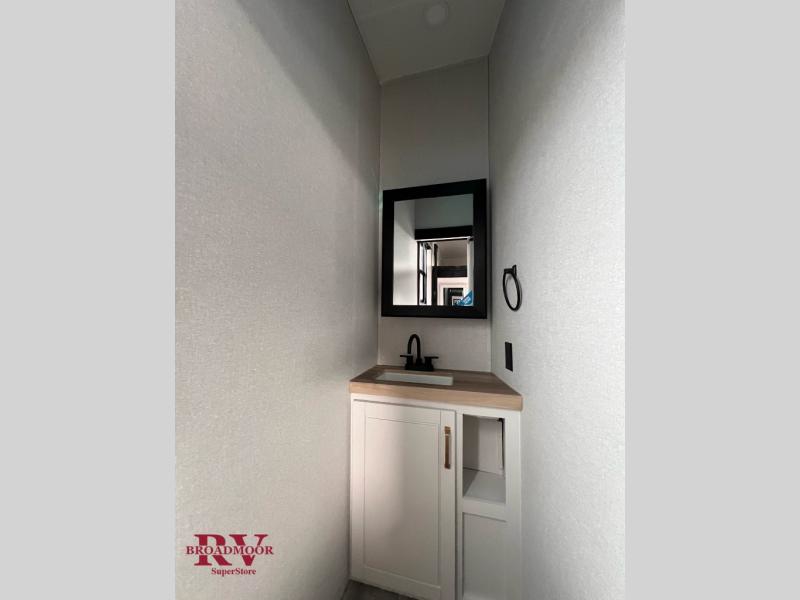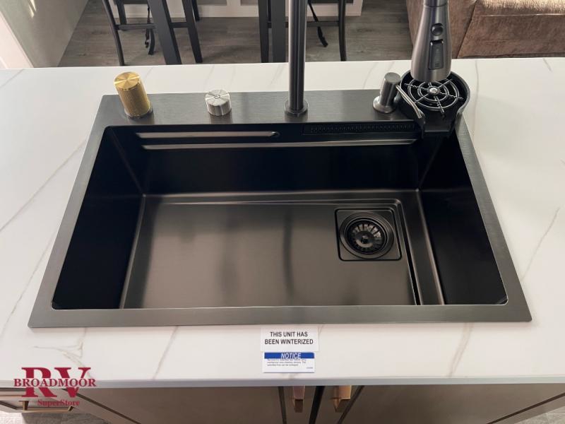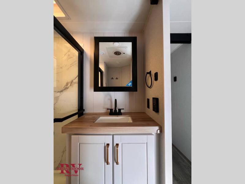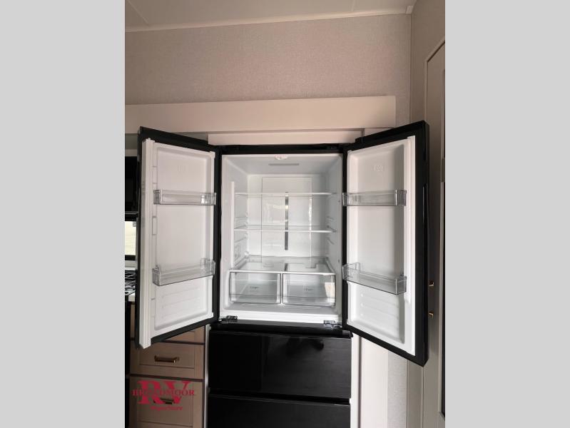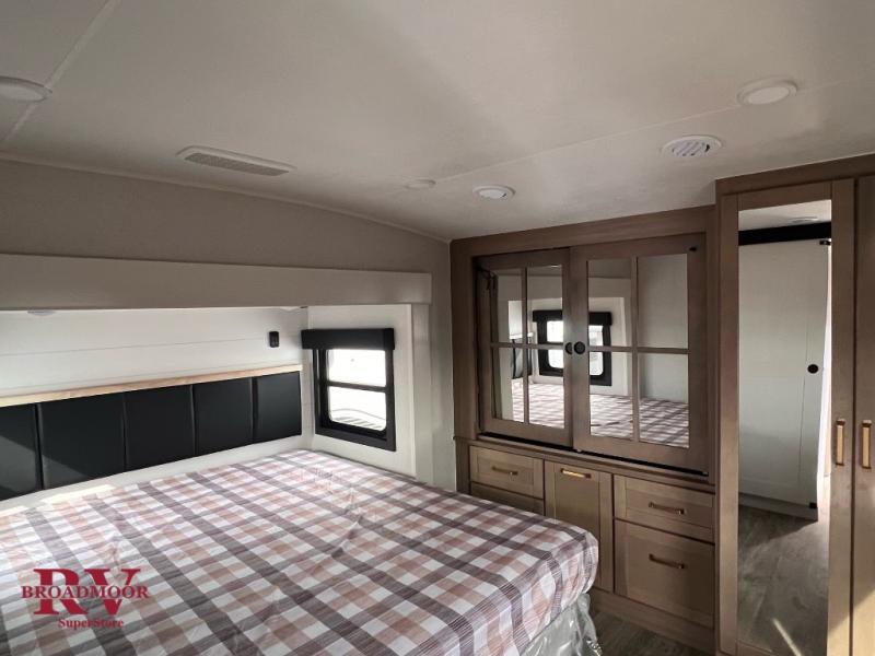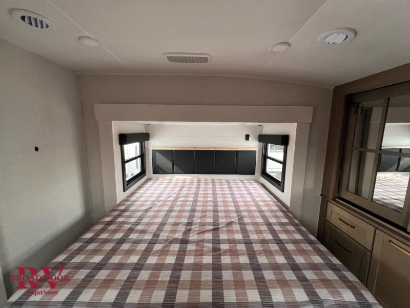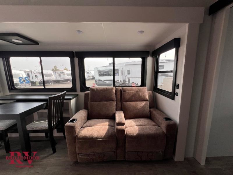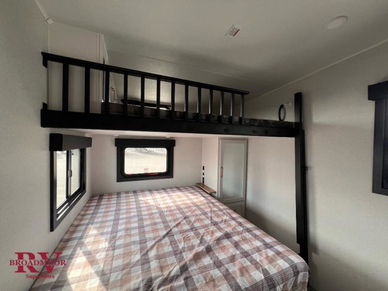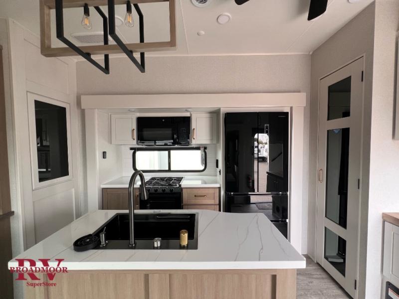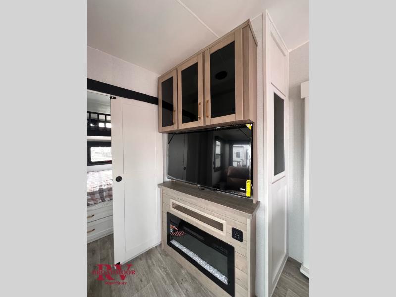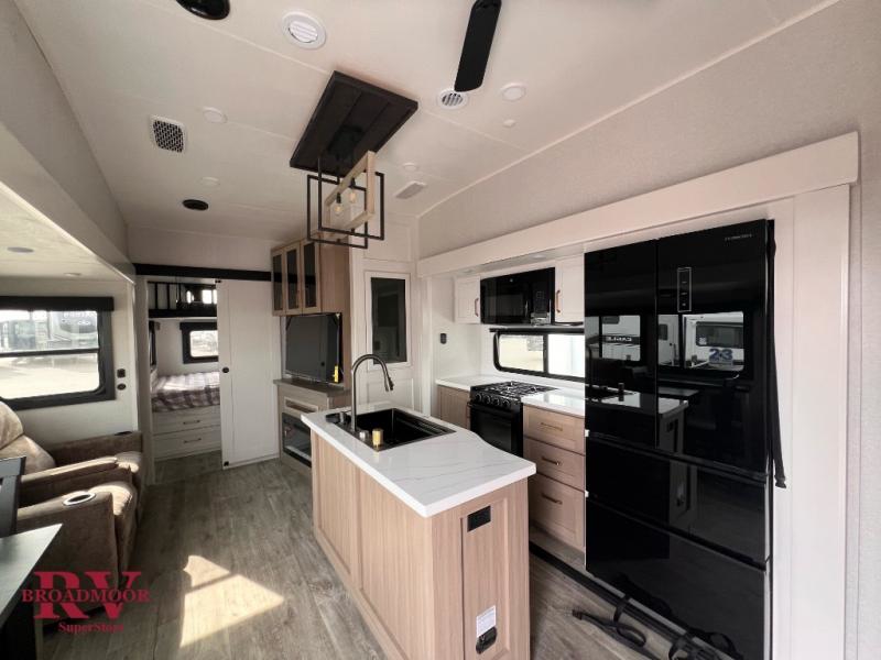 This fifth wheel is decked out in features you will love! The dual slides in the main living area create an open floorplan, and then there is a kitchen island that will make meal prepping easier. The theater seats plus table with chairs and a bench have a great view of the entertainment center and fireplace, and there is a ceiling fan here to keep the air moving. And did we mention there is an outside kitchen, complete with an outdoor refrigerator? This model also features a front private bedroom with a king bed slide out, a chest, and a front closet with convenient washer and dryer prep. There is also a rear private bunkhouse that has a 54" x 74" upper loft bed above a 66" x 80" Olympic bed with wardrobe storage drawers, as well as its very own half bathroom!