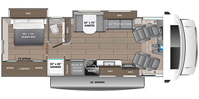 This motorhome includes double slides so you can enjoy more interior space, just like at home! The 42" x 70" booth dinette and 60" tri-fold sofa are in great view of the LED HD Smart TV, and your guests can sleep here, as well as on the cab-over bunk. This Greyhawk kitchen includes a Furrion all-in-one cooktop and oven, a residential-size microwave, and a pantry to store dry goods. You will find a convenient 30" x 36" shower, with the private toilet and sink across the hall so two people can freshen up at once. And don't overlook the rear bedroom with its queen bed slide out, dual bedroom wardrobes, and cabinet!