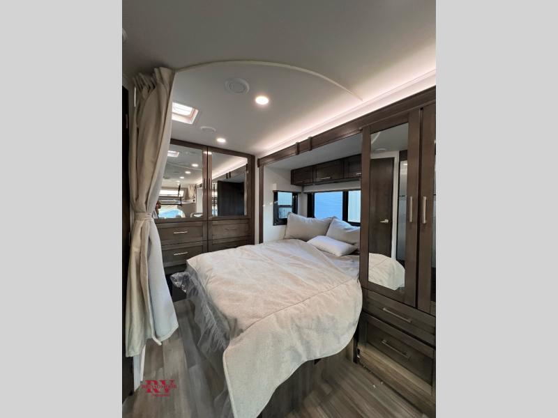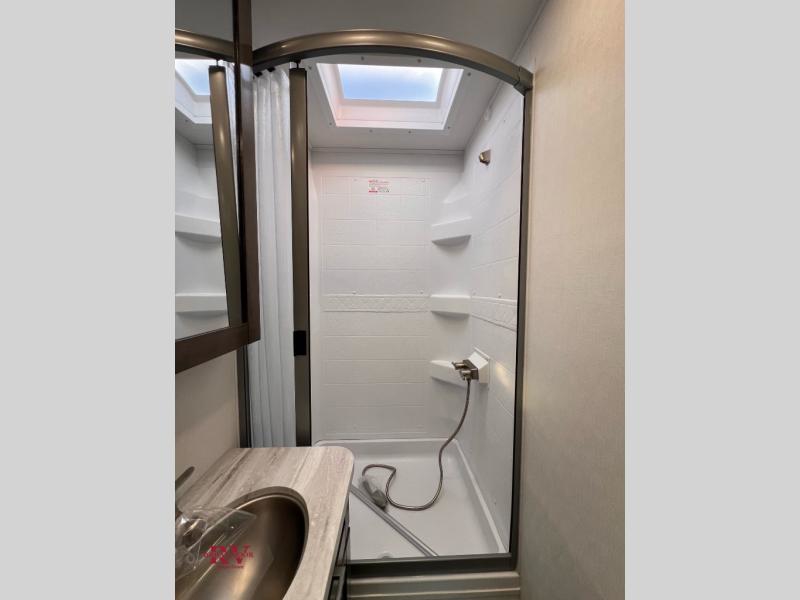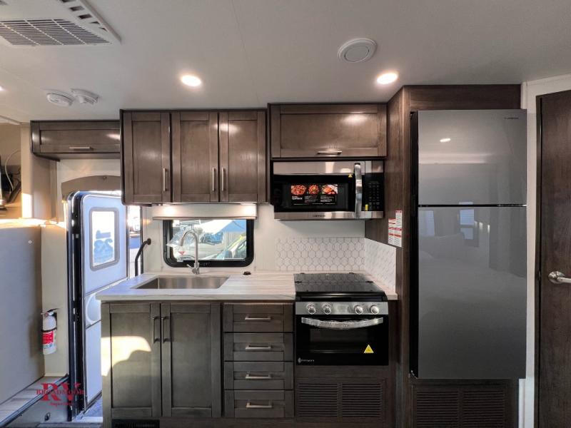 Easily load up and head out for an adventure in this Redhawk with sleeping space for five, a full bathroom, and kitchen amenities to stay fed the whole trip. Once at your campsite, easily let out the slide and the 16' electric awning and plan your next activity. You an use the full bath, make a meal in the kitchen with the Furrion all-in-one cooktop and oven, plus the residential-size microwave, and grab your beverage from the 10 cu. ft. refrigerator. The driver and passenger seats swivel for more interior seating, and if you like, choose the theater seating option in place of the U-shaped dinette.