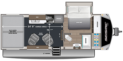 One look at the Seismic toy hauler travel trailers by Jayco, and you'll never go back! Each model features a custom automotive-grade vinyl exterior graphics package, a painted fiberglass front cap with built-in LED lighting, and 102" wide-body structural steel I-beam construction. You'll find the Slam-Latch baggage doors will make unpacking easier than ever, and the rear ramp door/patio with anti-slip, non-skid flooring will allow you to unload your toys with no trouble at all. These toy haulers feature a 30-gallon fuel tank with a timer and a Bluetooth stereo with four speakers to keep the party going. The Climate Shield zero degree tested weather protection includes a 35,000 BTU furnace and a fully enclosed and heated underbelly for better protection against the elements. And we haven't even touched on the interior luxuries you'll find, like solid hardwood cabinet doors, residential vinyl flooring made in the USA, roller shades, and more!