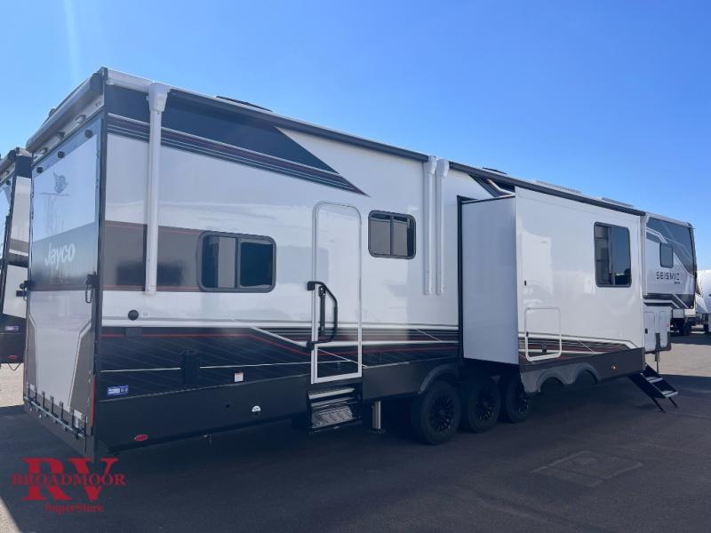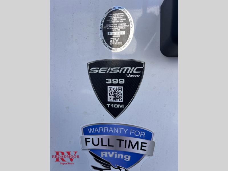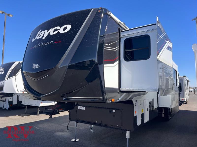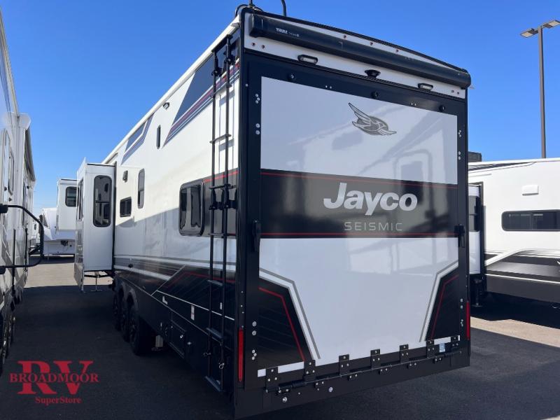 One look at the Seismic toy haulers by Jayco, and you'll never go back! Each model features a custom automotive-grade vinyl exterior graphics package, a painted fiberglass front cap with built-in LED lighting, and 102" wide-body structural steel I-beam construction. You'll find the pass-through storage with Slam-Latch baggage doors will make unpacking easier than ever, and the rear ramp door/patio with anti-slip, non-skid flooring will allow you to unload your toys with no trouble at all. These toy haulers feature a three seasons garage wall/doors, a 30 gallon fuel tank with a timer, and exterior marine-grade speakers to keep the party going. The Climate Shield zero degree tested weather protection includes a 35,000 BTU furnace, PEX plumbing, and a fully enclosed and heated underbelly so you can enjoy your adventures year around. And we haven't even touched on the interior luxuries you'll find, like solid hardwood cabinet doors, residential vinyl flooring made in the USA, night shades, and more!