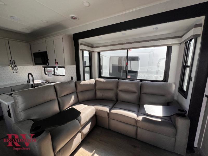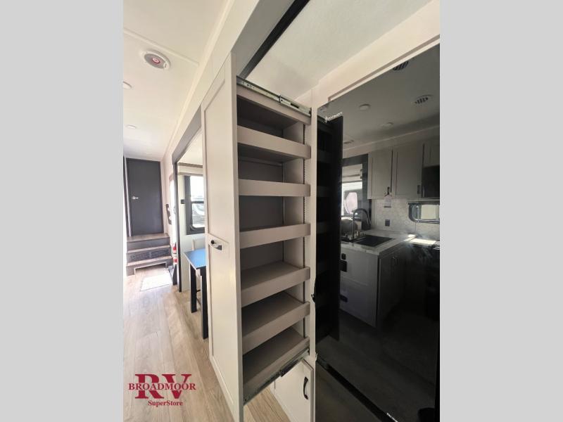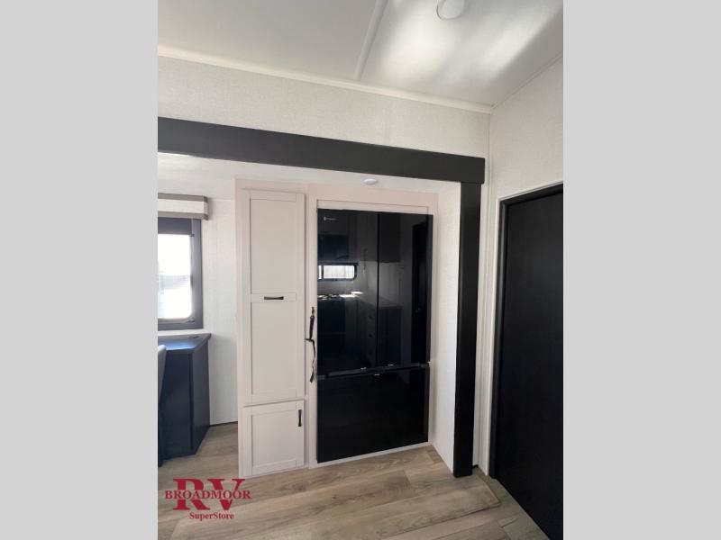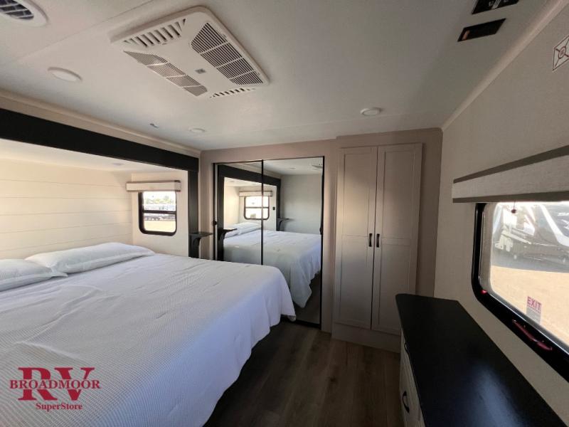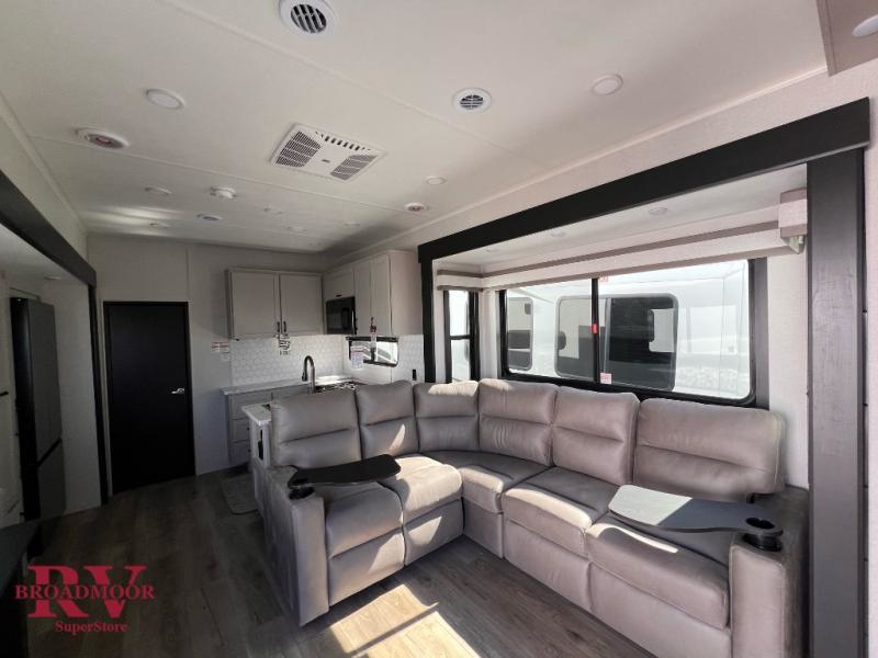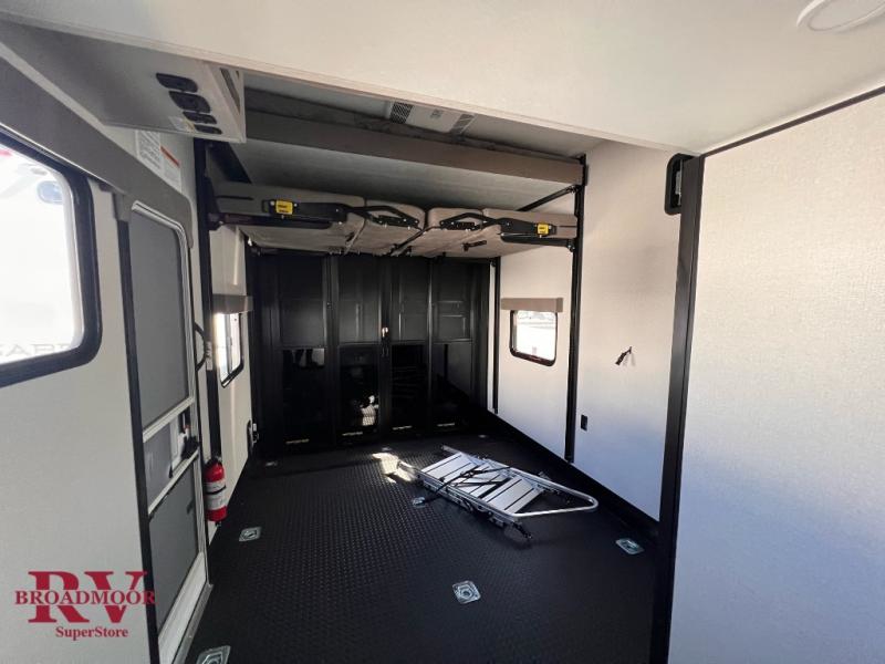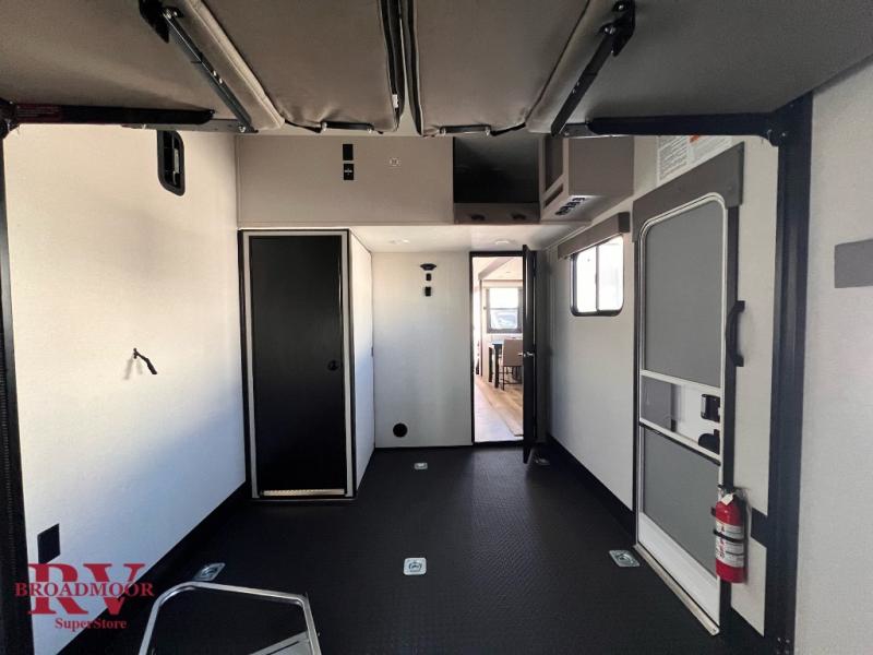 Get ready for outdoor adventures in this spacious toy hauler. Your guests will have the 13' 6" garage with queen bed with convertible sofa and a loft for added sleeping space, plus there is overhead storage for your things and a side man door to come and go easily. The main living area includes dual opposing slides with an L-shaped tri-fold sofa along the roadside and your dinette and refrigerator plus pantry in the curbside slide. Head up the steps to your front private bedroom with the dual entry bath accessible from the hall and inside the master bedroom. Here you will all enjoy a walk-in shower, toilet, and vanity with a sink, plus overhead storage. The bedroom features a third slide out housing a queen bed for added floor space, plus a full front walk-in closet, a dresser, and washer/dryer prep!