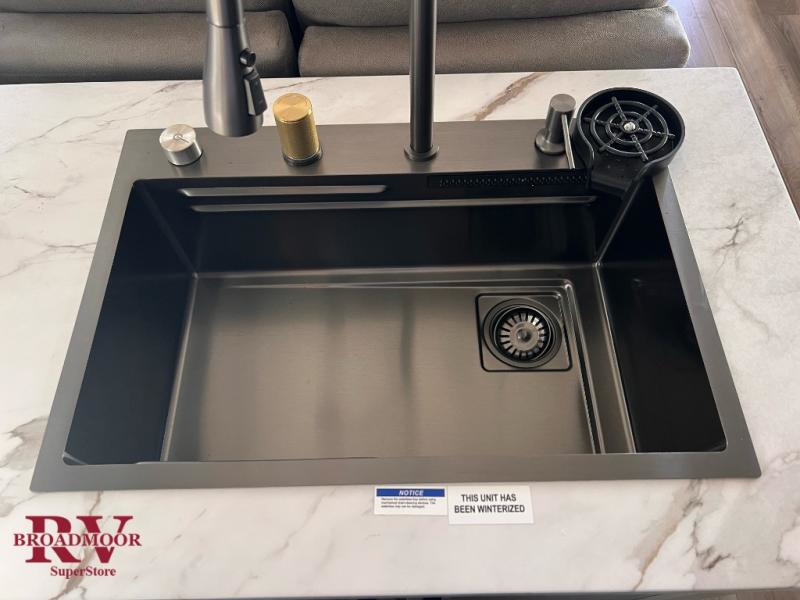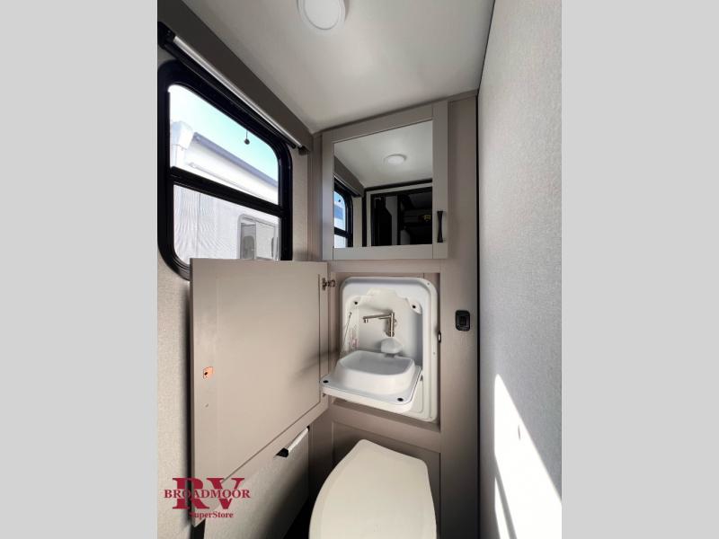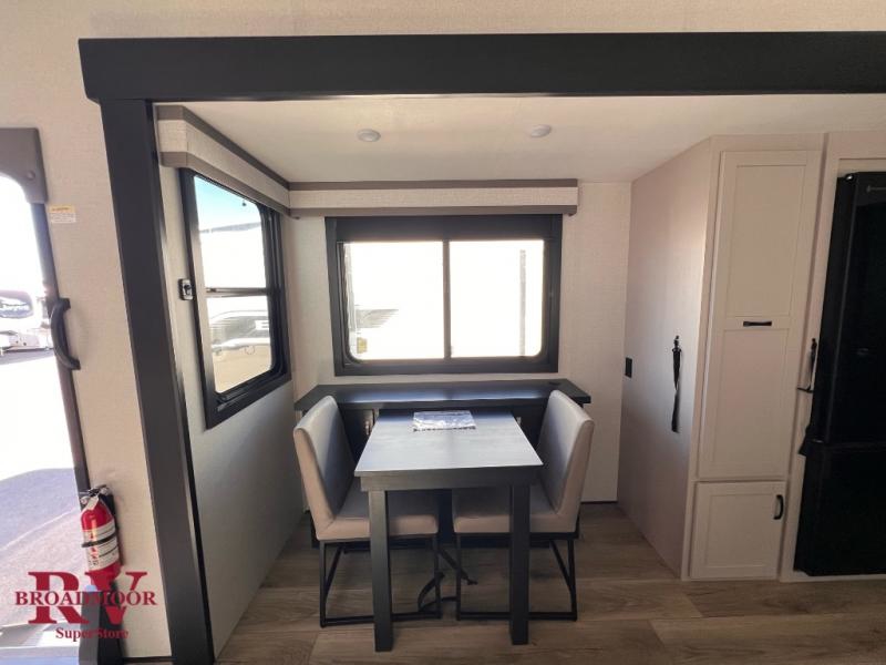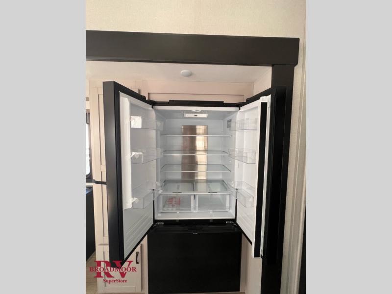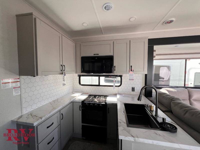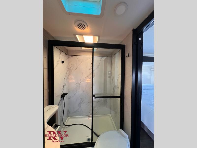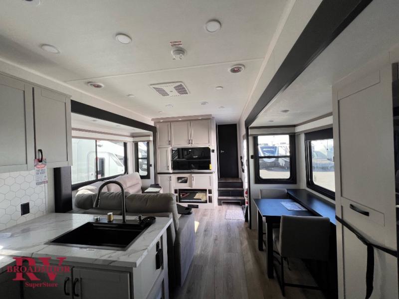 Get ready for outdoor adventures in this spacious toy hauler. Your guests will have the 13' 6" garage with queen bed with convertible sofa and a loft for added sleeping space, plus there is overhead storage for your things and a side man door to come and go easily. The main living area includes dual opposing slides with an L-shaped tri-fold sofa along the roadside and your dinette and refrigerator plus pantry in the curbside slide. Head up the steps to your front private bedroom with the dual entry bath accessible from the hall and inside the master bedroom. Here you will all enjoy a walk-in shower, toilet, and vanity with a sink, plus overhead storage. The bedroom features a third slide out housing a queen bed for added floor space, plus a full front walk-in closet, a dresser, and washer/dryer prep!