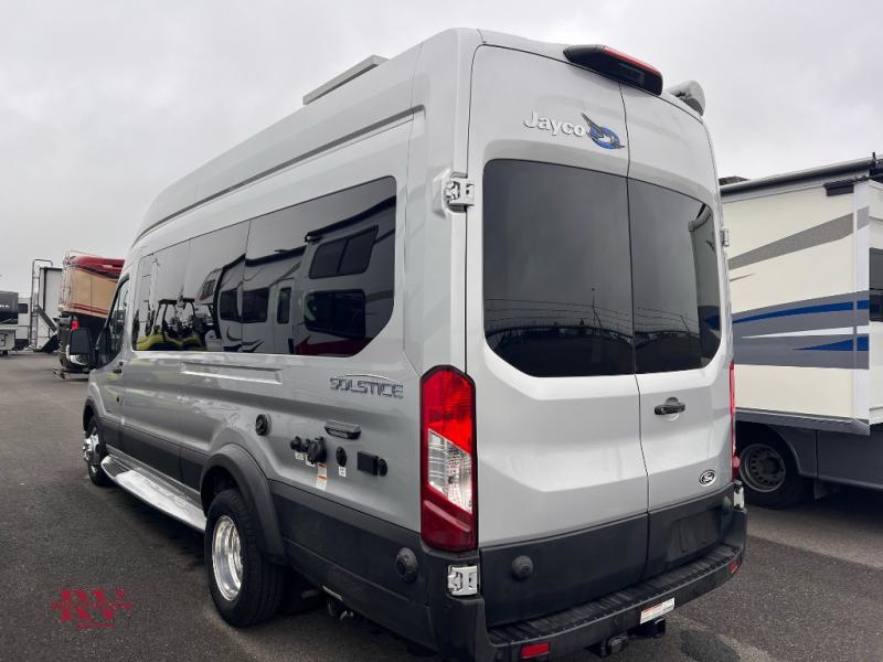 Travel in luxury with the Jayco Solstice Class B gas motorhome! The Ford Transit AWD 350HD chassis and 3.5L EcoBoost V6 310HP engine will take you to all of your favorite destinations. The rear-view camera with trailer hitch assist, Advance Trac with roll stability control, and SOS Post Crash Alert system will help keep you safe on every journey. Bring fresh air inside with the sliding vented windows and the side screen door with magnetic and zipper close offs. The mandatory Customer Value package includes JRide for a smooth ride, a Carefree® armless motion sensing patio awning with LED light strip, and a Truma Combi Eco Plus water heater and furnace.