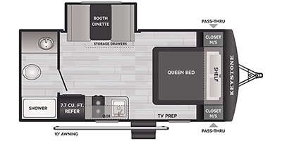 It's time to enjoy the great outdoors with family and friends at the campgrounds you like to meet everyone at! This trailer will allow three to four to camp comfortability with amenities such as a two burner cooktop, a 7.7 cu. ft. refrigerator, and a spacious rear full bathroom. The booth dinette slide offers a place to dine, read a book and even provides sleeping space and storage drawers for board games or throw blankets. The slide gives the interior more floor space as well. This model also includes a walk-around queen bed that will make your space feel a little more like home!