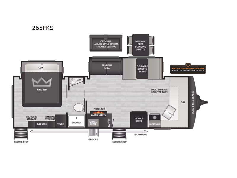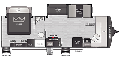 It won't be hard to feel right at home in this dual entry, front kitchen travel trailer! You will be impressed by the generous amount of solid surface countertops, along with an entryway pantry, a three burner range, and a 10 cu. ft. refrigerator. A Do-More dinette table and tri-fold sofa sit within a slide for more space, and the entertainment center with a fireplace is in great viewing for movie night. A walk-thru bath leads to the rear master bedroom, complete with a king bed slide, hanging storage, a wardrobe, and a dresser for ample storage space