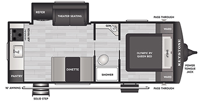 This travel trailer offers a comfortable layout! The rear kitchen is a chef's dream, featuring a three-burner stove, pantry, sink, and fridge - prep meals with ease. The booth dinette is perfect for dining, and the theater seating is ideal for relaxing. The walk-through bathroom is a plus, leading to the front bedroom with an Olympic RV queen bed and plenty of wardrobe space. And with double entry doors, getting in and out is a breeze. Perfect for couples or small families looking for a cozy getaway!