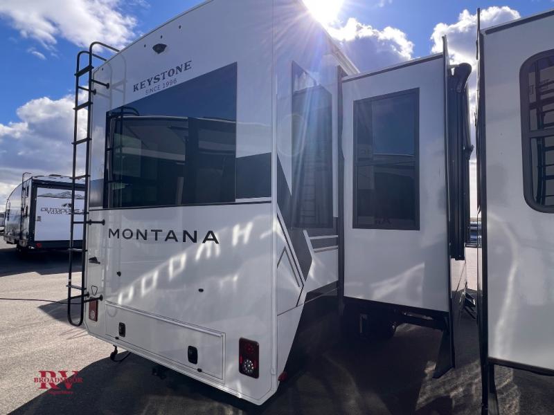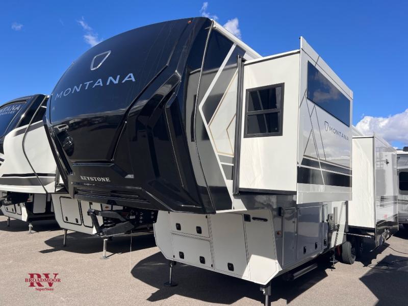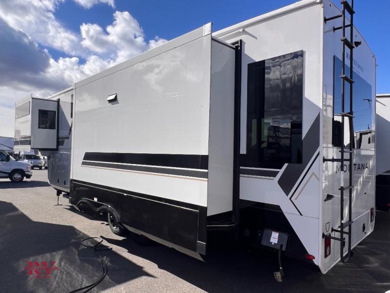 Enjoy luxury, innovation, and the outdoors in any one of Montana's finest fifth wheels. Each set the standard with exceptional features, and exciting factory installed options to provide you a great home on the road. Keystone's 12" I-beam chassis with z-frame technology provides a strong and durable foundation to your fifth wheel, and the four-season living package will help extend your camping season. There are also square frameless windows outside, along with storage solutions, and a hydraulic 6-point leveling system that will have you set up in no-time! Inside, you'll love the hardwood cabinetry, solid surface countertops, spacious showers, and cozy bedrooms!