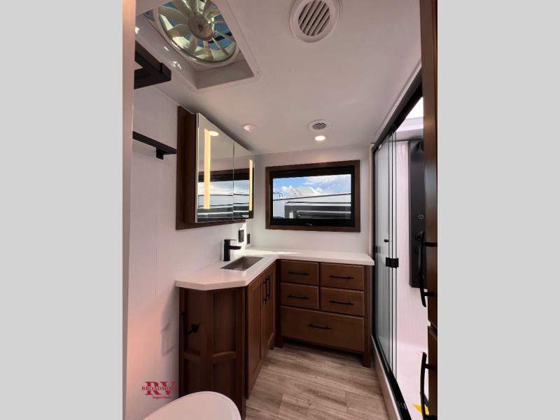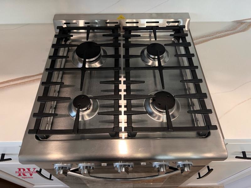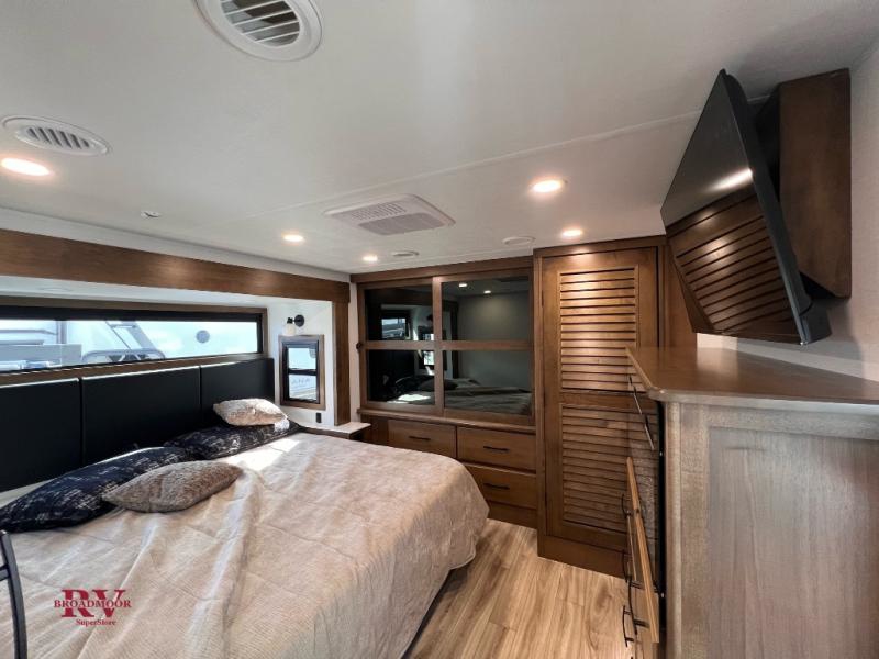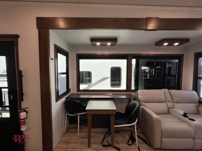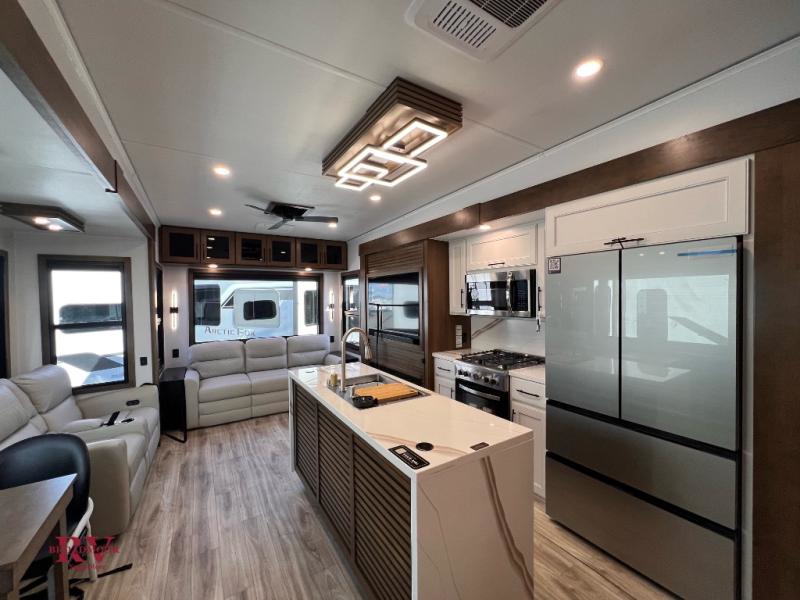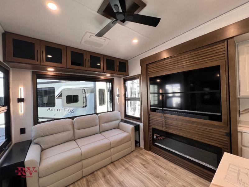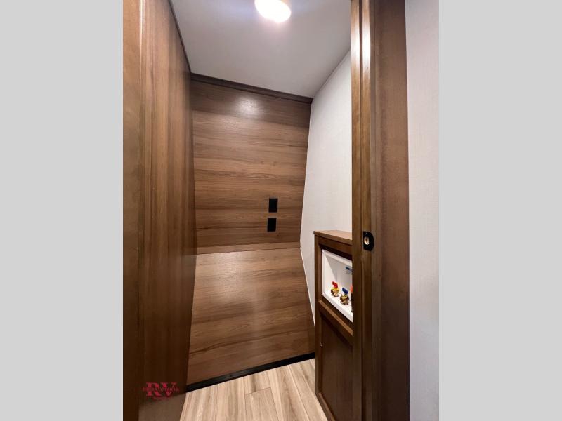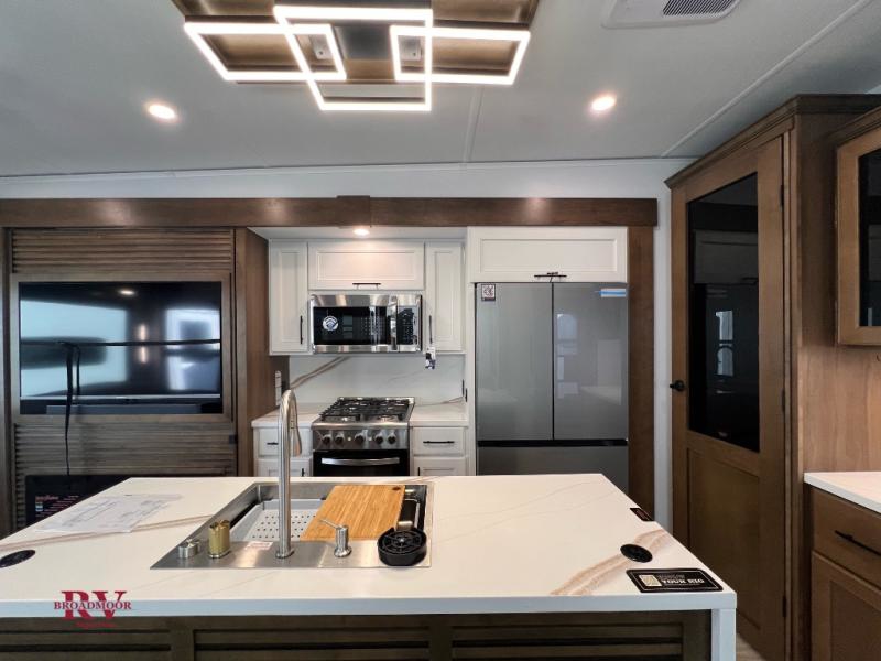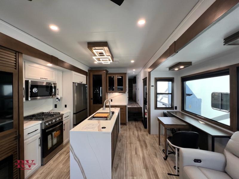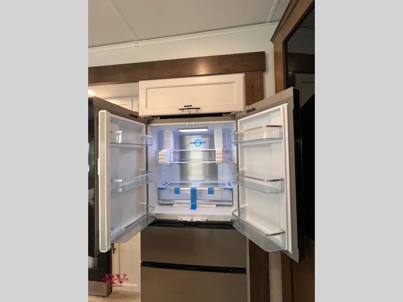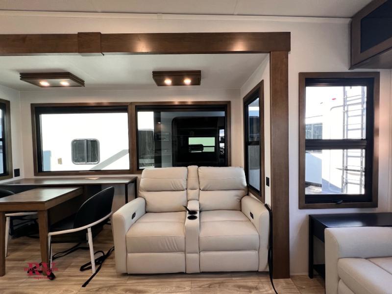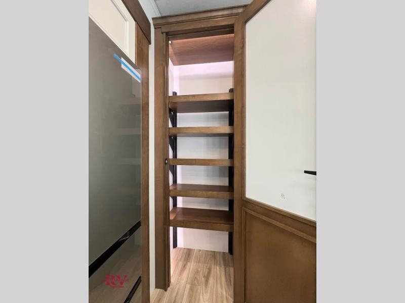 It won't be hard to find comfort in this fifth wheel with triple slides for more space, a spacious front bedroom, and a rear living area with a comfy sofa! Once you've unloaded the exterior pull-out storage tray, you can put out the two awnings, then relax in your camp chairs. A four-burner range inside will let you make lunch for your crew, and a spacious kitchen island will provide more counter space. There is also a pantry, overhead cabinets, plus a second, swing-out hidden pantry behind the entertainment center with a fireplace. The dinette with four chairs, power theater seating, and rear sofa will give you plenty of seating options, and the dual opposing slides in the combined kitchen and living area will create an open floorplan you are sure to love. Head towards the front to freshen up in the spacious bath with ample counter space, then enjoy a perfect night's rest in the front bedroom, complete with a king bed slide, dual nightstands, front wardrobe, plus a second wardrobe with washer and dryer prep.