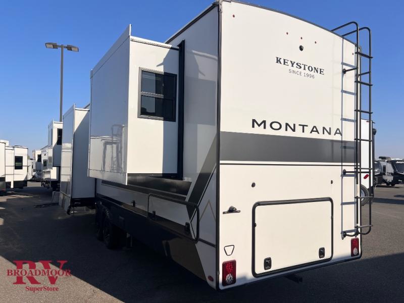 Enjoy luxury, innovation, and the outdoors in any one of Montana's finest fifth wheels. Each set the standard with exceptional features, and exciting factory installed options to provide you a great home on the road. Keystone's 12" I-beam chassis with z-frame technology provides a strong and durable foundation to your fifth wheel, and the four season living package will help extend your camping season. A few other construction features you will appreciate include a MORryde CRE3000 suspension, a fully walkable roof with an alpha seamless TPO membrane system, and 4k square frameless tinted safety glass windows. Each feature stylish interiors with two decor choices paired with beautiful hardwood cabinetry, Beauflor vinyl flooring throughout, central vacuum, plus a La-Z-Boy furniture package for all-around comfort!