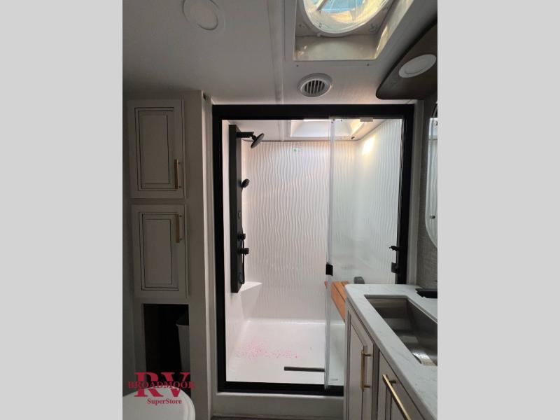 Life will be easier at the campground in this fifth wheel with five slides and an outdoor kitchen! The spacious full bathroom has a 48" x 30" fiberglass shower with a seat and skylight above, a linen closet to keep your towels close, and a stylish sliding door. The bedroom has a king bed slide with storage underneath across from a dresser with a 32" HDTV, as well as a large closet and an additional closet with stackable washer and dryer prep. The chef can prepare their best meals with extra counter space provided by the roll-out counters and the glass top range with a convection microwave, plus there is a pantry and a pivot dinette to enjoy your meals at. The front of this fifth wheel is where it stands out above the rest; there is a spacious living area with two hide-a-bed sofas, power theater seating, and a private front office, complete with a desk, storage, and counter space!