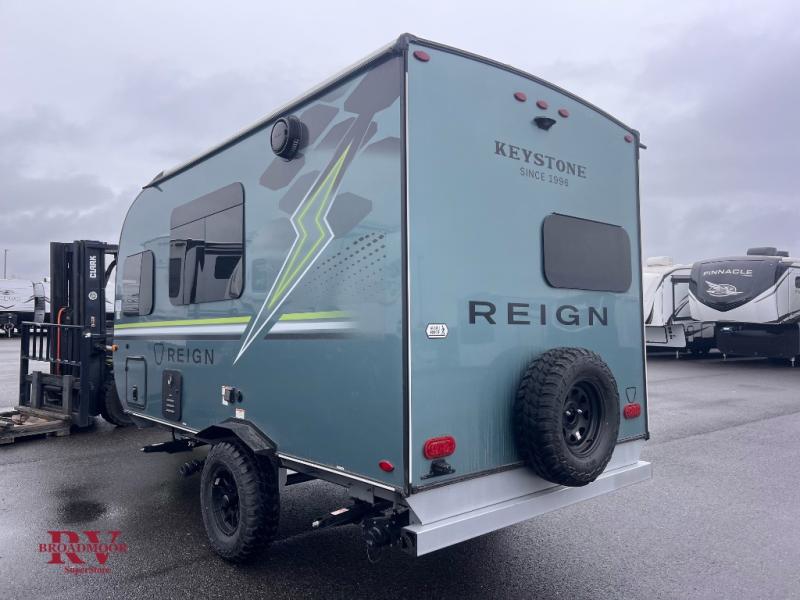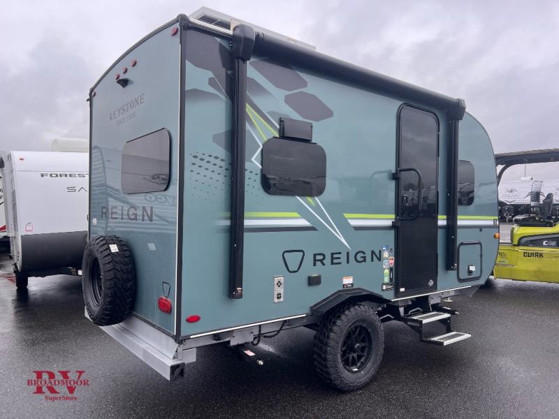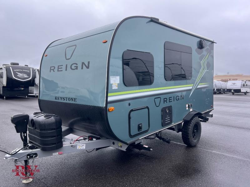 The Reign travel trailers by Keystone are premium single-axle units that are sure to make an impression at the campground. Each one is built with an exclusive automotive-finished aluminum exterior, a walkable roof, and a 100% composite floor for added durability. There are also tinted safety glass windows, quick drop stabilizer jacks, and an exterior shower with hot and cold water. The European inspired interior design is unique and cozy, and the 78" interior height will give you plenty of space to move about. You will also enjoy the ultra bright LED light strip and solid surface countertops in the kitchen, along with blackout night shades, and many more interior comforts.