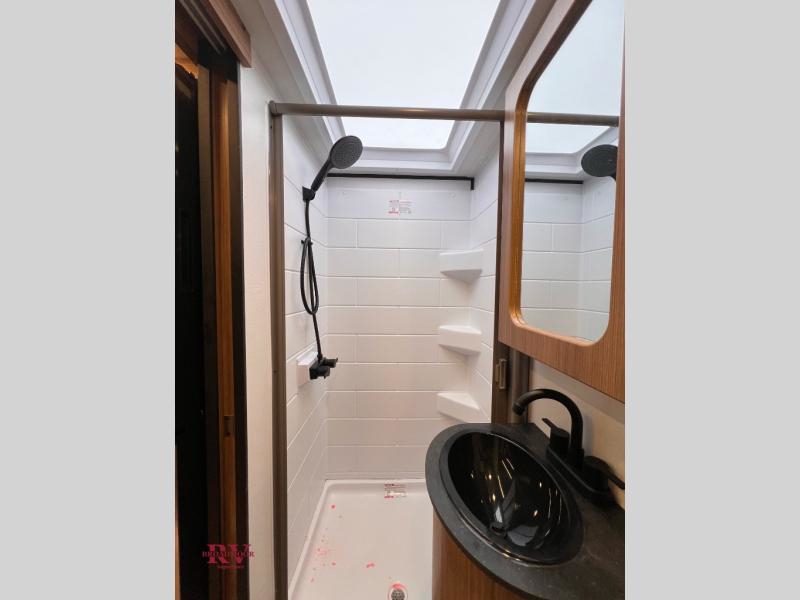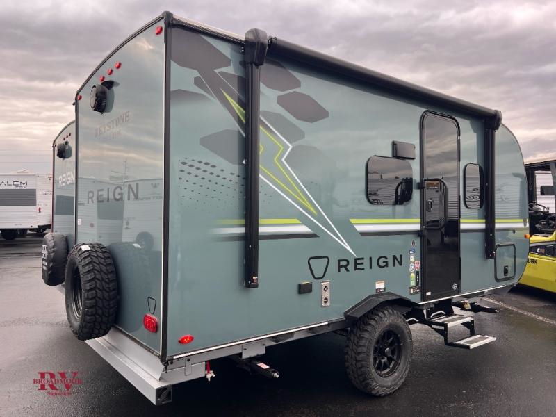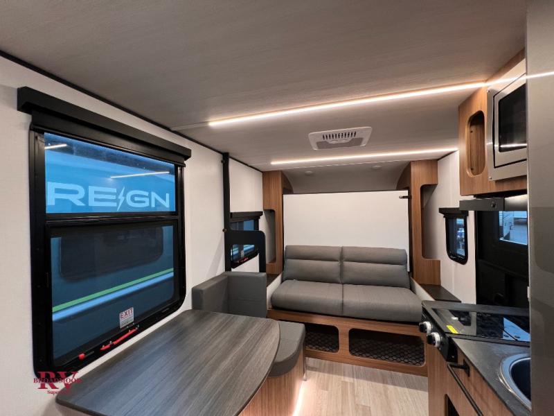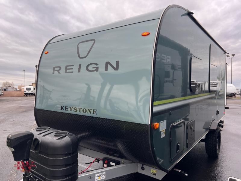 The Reign travel trailers by Keystone are premium single-axle units that are sure to make an impression at the campground. Each one is built with an exclusive automotive-finished aluminum exterior, a walkable roof, and a 100% composite floor for added durability. There are also tinted safety glass windows, quick drop stabilizer jacks, and an exterior shower with hot and cold water. The European inspired interior design is unique and cozy, and the 78" interior height will give you plenty of space to move about. You will also enjoy the ultra bright LED light strip and solid surface countertops in the kitchen, along with blackout night shades, and many more interior comforts.