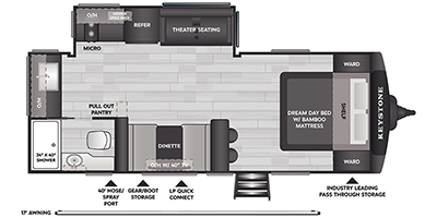 You and your spouse will love this travel trailer’s plush dream day bed with a comfortable bamboo mattress. Ample storage is provided by the wardrobes on each side of the bed, keeping your favorite outfits within easy reach. The booth dinette and theater seating provide perfect spots to enjoy meals, play games, or relax with loved ones. Plus, the layout is designed to maximize comfort and conversation. Whip up meals and snacks with ease and enjoy the convenience of having everything you need in one place since the kitchen is equipped with essentials, including a refrigerator, microwave, and pull-out pantry. Also, the full bathroom provides a convenient private space to get ready for the day.