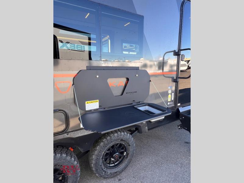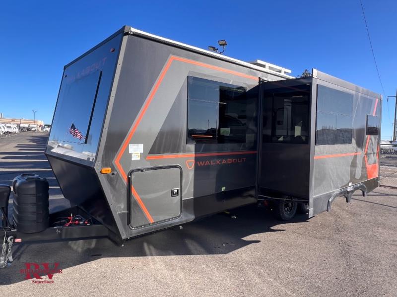 Each Keystone Walkabout travel trailer features a rugged automotive-grade aluminum exterior, designed to withstand the rigors of travel. The 11-gauge aluminum powder corner rails add strength and durability while keeping the trailer lightweight. It is known that storage is key to a comfortable trip. That's why these trailers are designed with maximum storage in mind, providing ample space for all your gear and equipment. You'll also feel like you're gliding down the road, not bouncing along, thanks to the Kurt Touring suspension that ensures a smooth ride, even on rough terrain. Further, the composite solid steps are durable and easy to clean, while the composite Thinscape countertop offers a stylish, low-maintenance surface for food prep and relaxation. Finally, with the 110-volt outlets throughout the trailer, you'll have plenty of power to keep your devices charged and your appliances running.