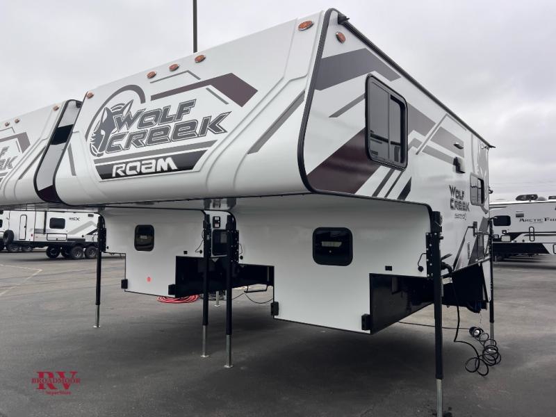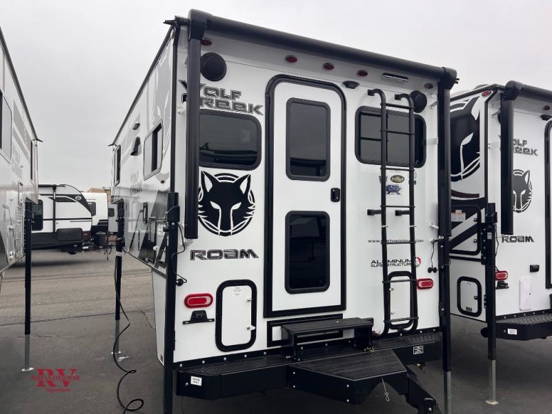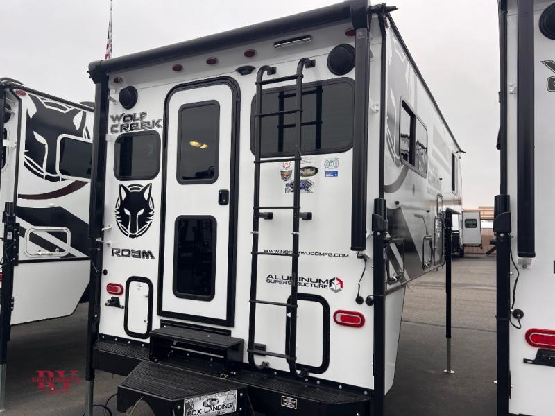 With any Wolf Creek truck camper by Northwood you can camp year around thanks to the high density block foam insulation, thermal pane windows, and the multi-layered substrate walls. The durable fully welded, thick-wall aluminum frame construction will add durability, and the Corona treated fiberglass will help combat leaks so you can enjoy your camper for years to come. Each model includes fabric night shade window treatments, custom one-piece formed countertops and dinette table, hardwood cabinet doors, and many more comforts. You will love the high value features included within the Wolf Pack, such as a Fox Landing ready rear bumper, a premium vent, electric jacks, and outside speakers.