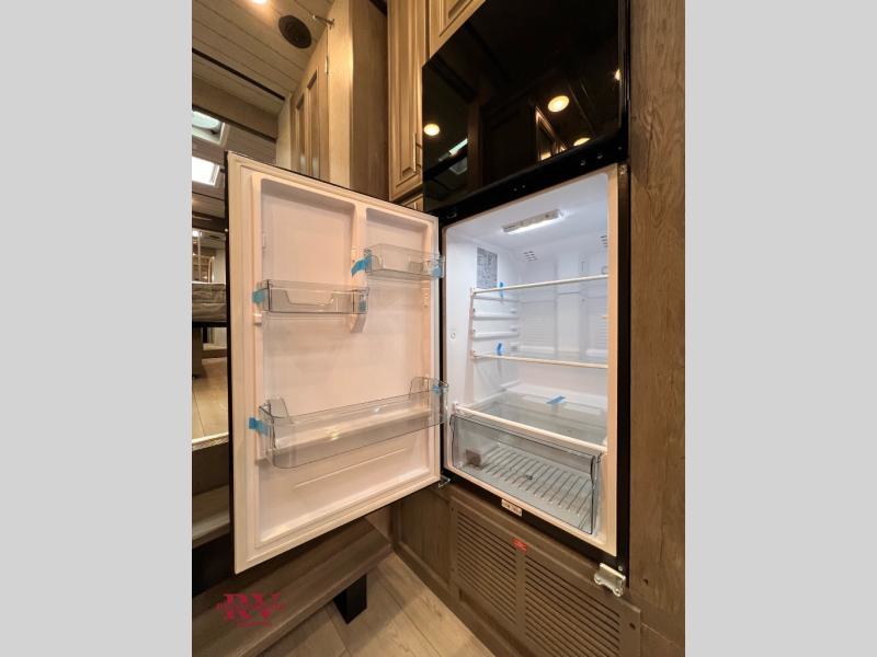 Endless nights of entertainment are given thanks to this fifth wheel rear living area! A tri-fold sofa for comfortable seating and sleeping, two cross-stitch swivel rocker-recliners for ultimate relaxation, a free-standing table with four chairs for dining and socializing, and a TV for entertainment. The kitchen is equipped with a fridge, a two-burner cooktop for culinary art, and two pantries for ample storage of snacks and ingredients. After a long day of exploring nature you will want to relax in the walk-through bathroom, that features a fiberglass shower with seat, providing a comfortable space for freshening up. After, rest in the front bedroom’s spacious king bed and organize your belongings in the convenient dresser and the full-width quad slide wardrobe. You can also enjoy of outside activities without caring about the weather thanks to the exterior awning.