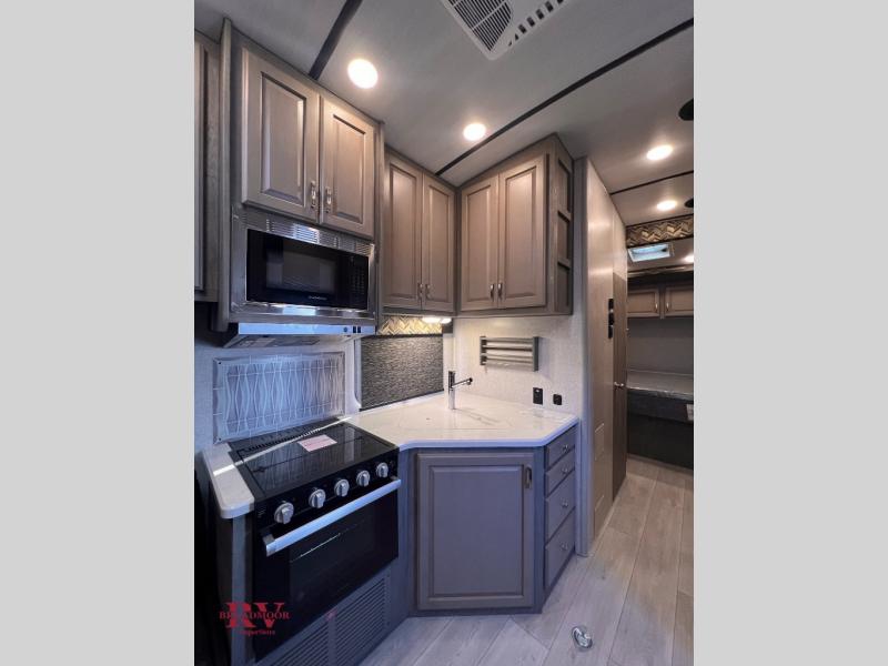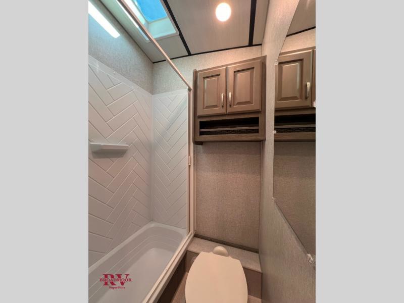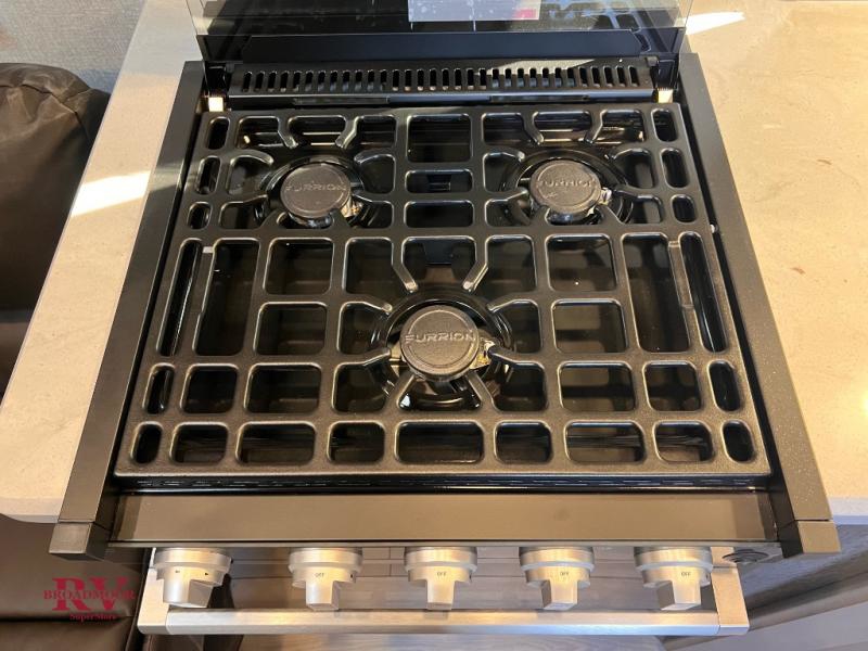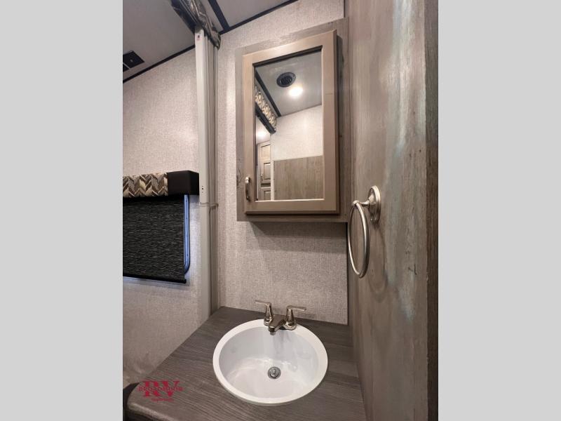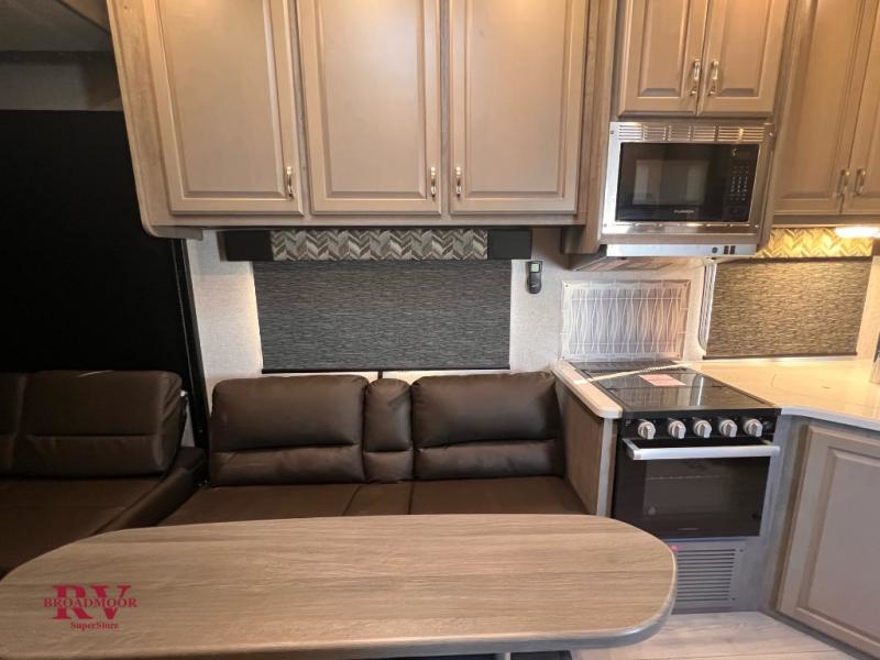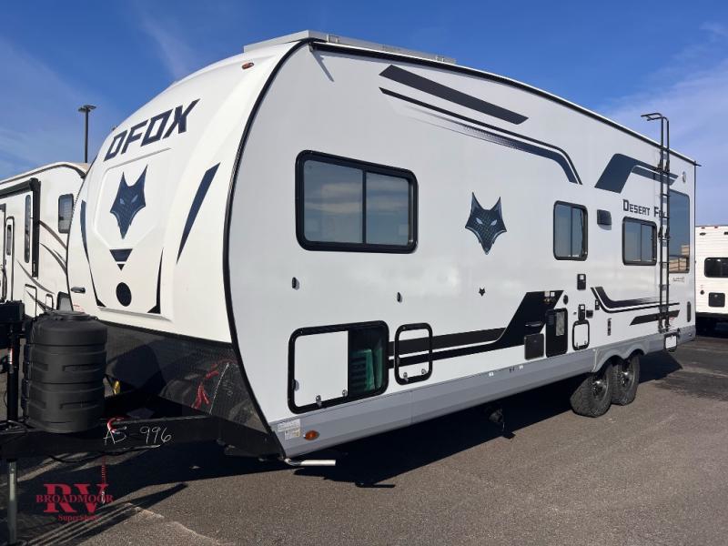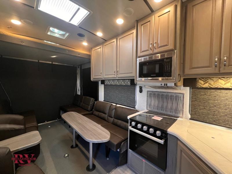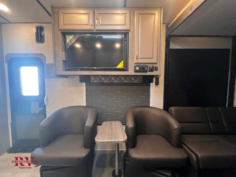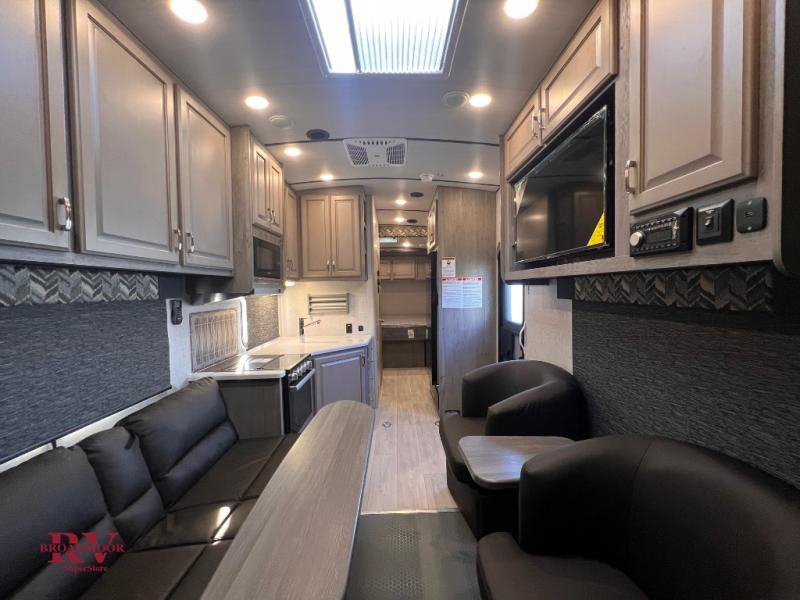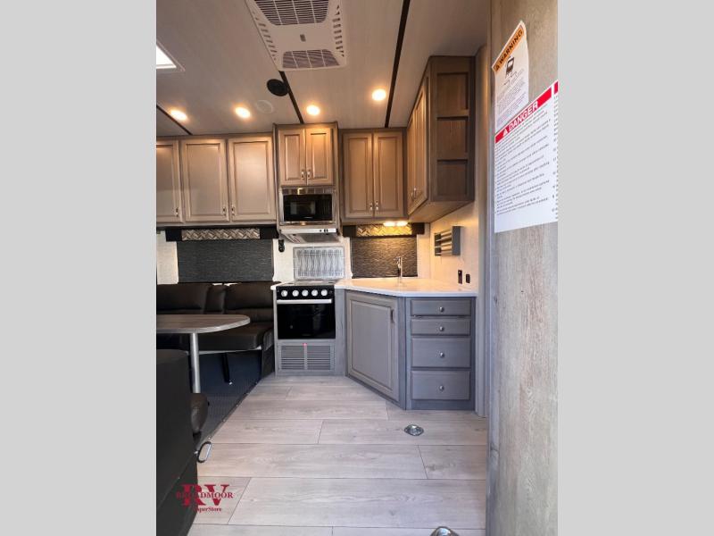 You can enjoy plenty of vacations with this Desert Fox toy hauler! There is a semi-private bedroom when you close the privacy curtain, and the bathroom has the vanity just outside the door so that someone can get ready while another is showering. The 10 cu. ft. stainless steel refrigerator will make it easy for you to bring along your favorite foods, and the high-output three-burner range will help you prepare those foods. There is a kitchen skylight with shade to bring in some sunlight while you cook. A 32" LED Smart TV rests in the living area so that you can watch a movie when it's time to come inside for the night.
