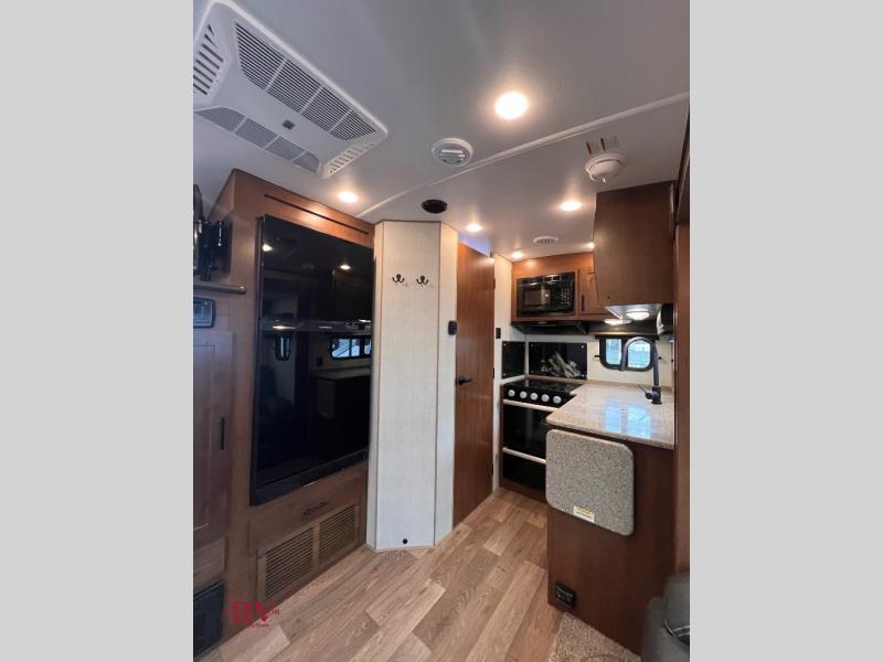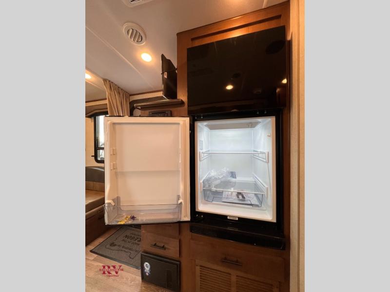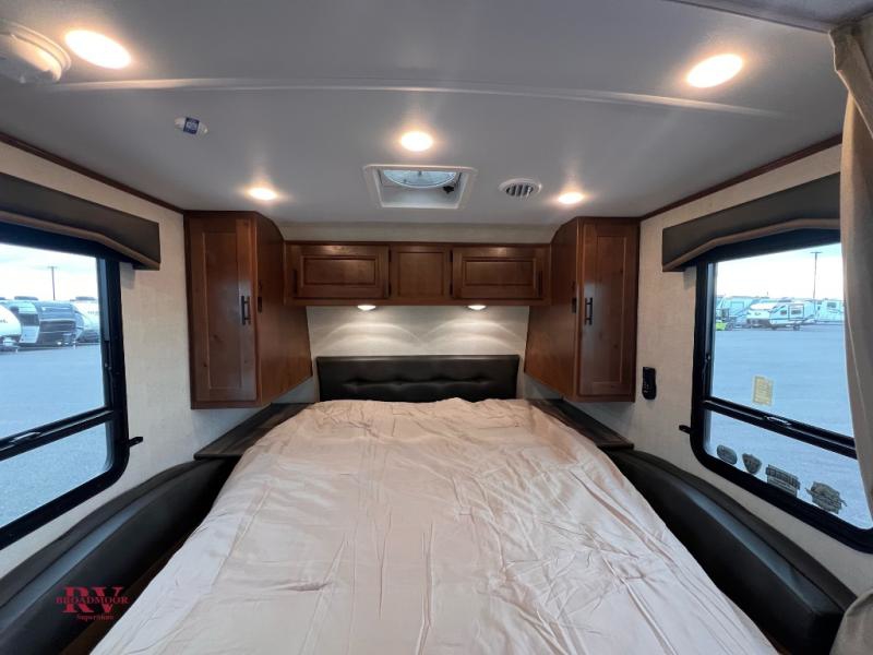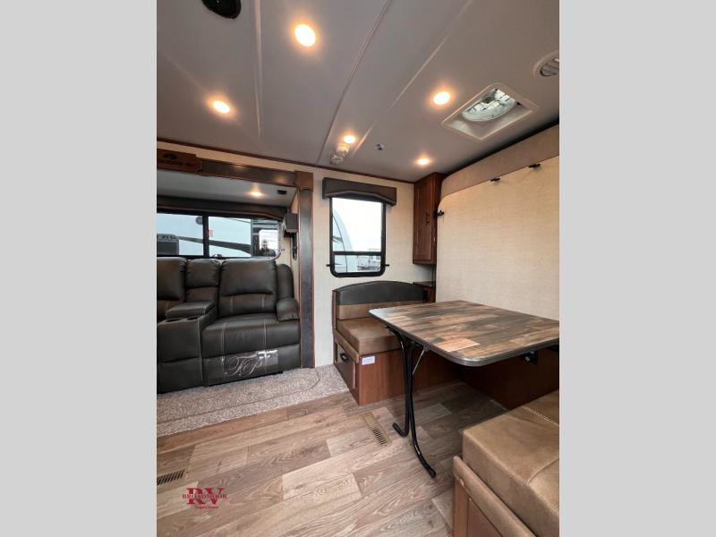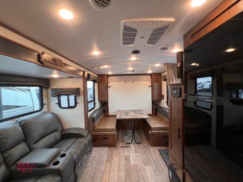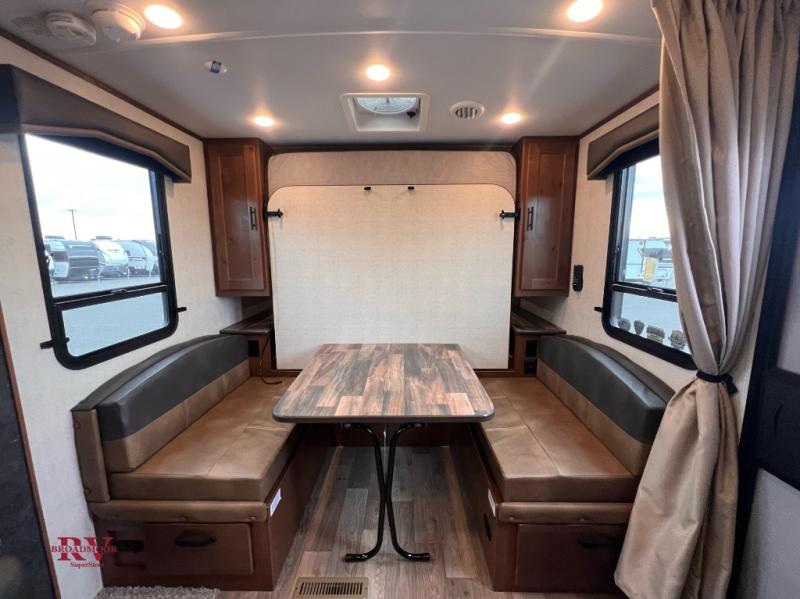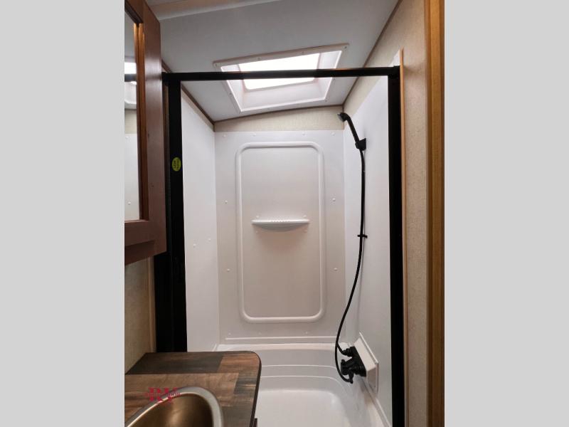 Versatility and comfort is found in this spacious travel trailer. There is a queen Murphy bed up front that can fold away into the wall so you can dine at the fold down booth dinette. The residential sofa with built-in recliners will be the perfect place to relax as you watch a movie on the TV, and the single slide out here will provide more interior space. This model includes a rear corner kitchen with plenty of counter space to prep meals and the full bath is in the other rear corner for privacy. You'll also enjoy the shower skylight for more head room, plus a living area skylight for more natural light.