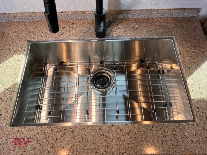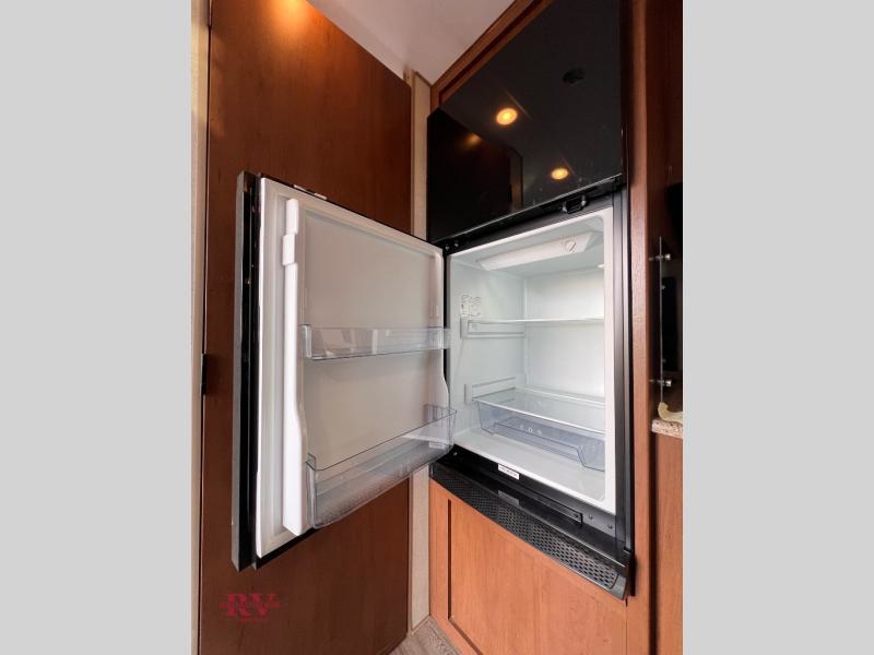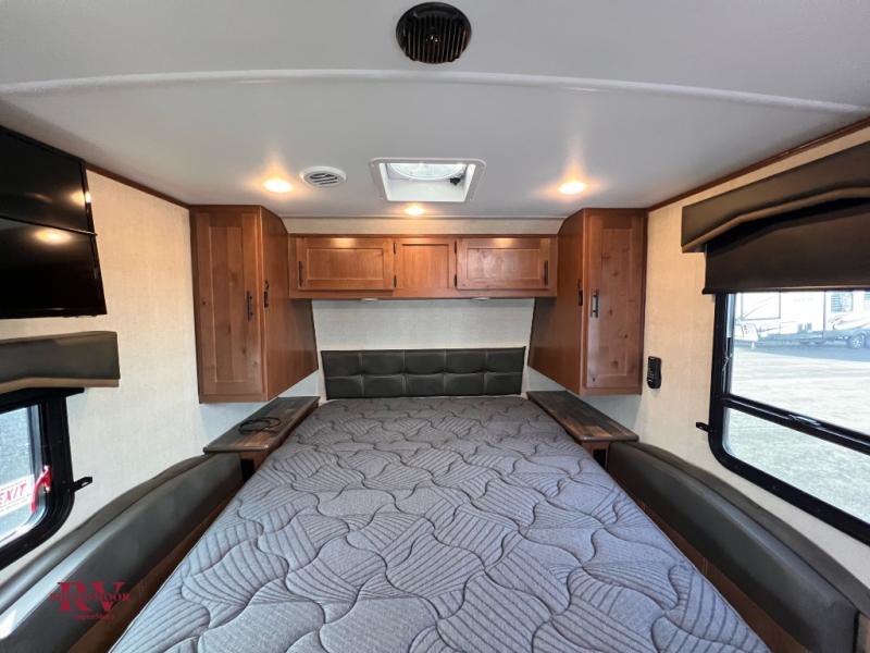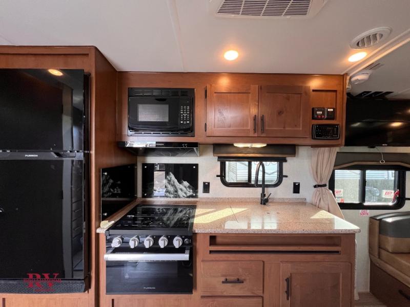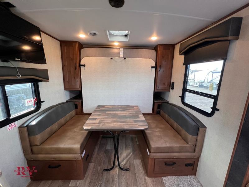 This travel trailer will be perfect for weekend trips in the woods! Once you enter the unit, you'll find a pantry where you can grab a snack from, plus a spacious full bath to freshen up after hiking. The slide out not only gives you more space, but it also houses the residential sofa with built-in recliners, or you can choose the optional sleeper sofa here if you need more sleeping space. A full kitchen lets you make meals for your crew, and a fold-down dinette table will be the perfect spot to dine together. There is also a queen wall/Murphy bed that fold down over the dinette when you're ready for bed!