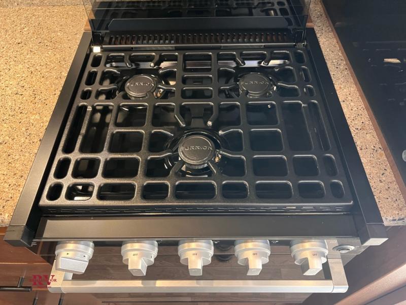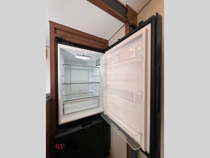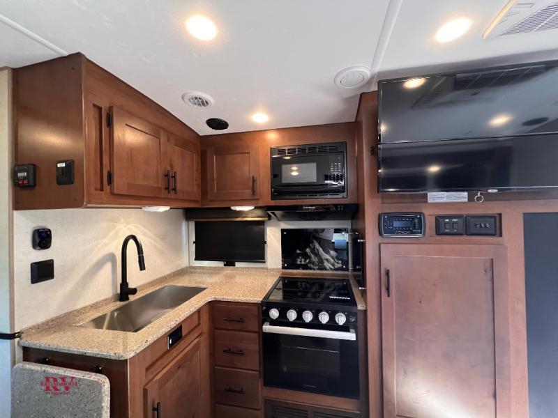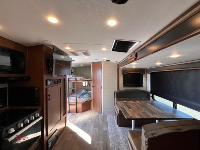 How does double-size bunks sound for your next camping trip? The kids or your guests are sure to love them, while you enjoy the queen bed in the front bedroom. There is a garage storage door that will be perfect for luggage, lawn chairs, and coolers, plus there is plenty of storage inside as well. The chef of your group will love cooking in the kitchen with its flip-up counter, three burner cooktop, and skylight for natural light. The mountain dinette slide in the main living area will provide space to let the dog rest on the floor, and there is a 40" TV for movie night!