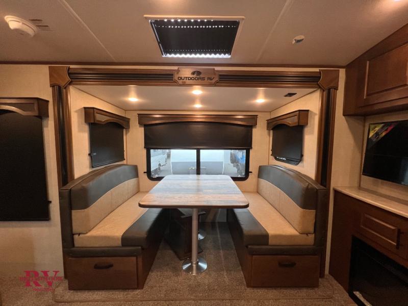With any Timber Ridge Titanium Series travel trailer by Outdoors RV you will enjoy the sleek design frameless thermal pane windows, along with the silver fiberglass front cap and Titanium Series graphics package. The rugged 8' chassis with 5,100 lb. axles and XL ground clearance will make maneuvering tougher terrain easier than ever, and there is a wireless rear, side(s) turn camera system for hassle-free parking. Each model includes LG solid surface countertops, mountain lodge interiors, hardwood slide out fascia(s), and many more comforts!