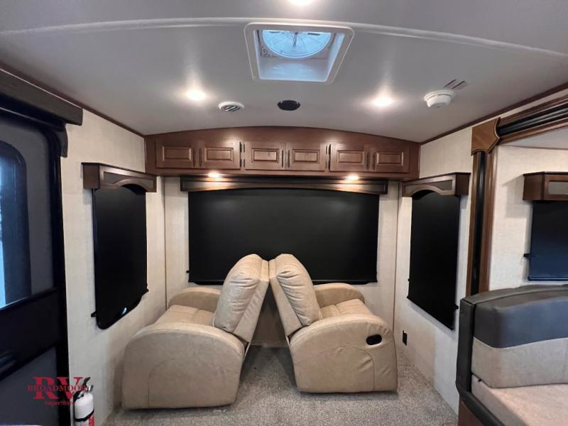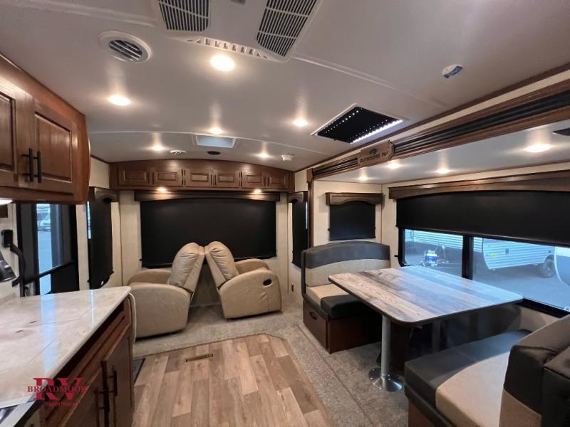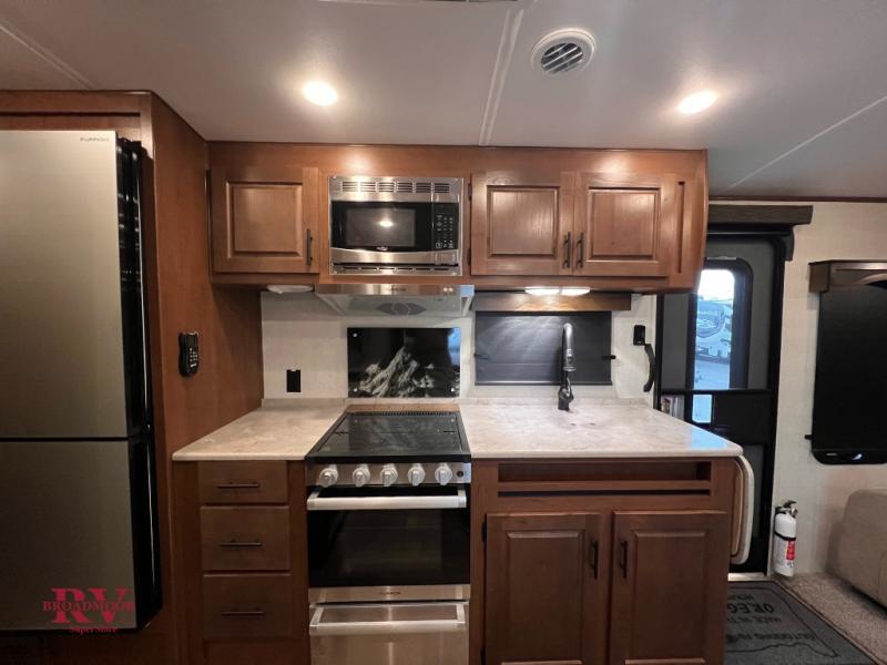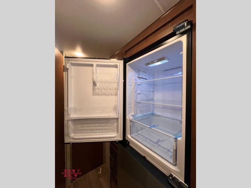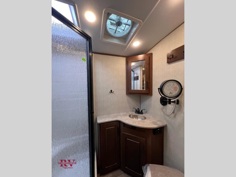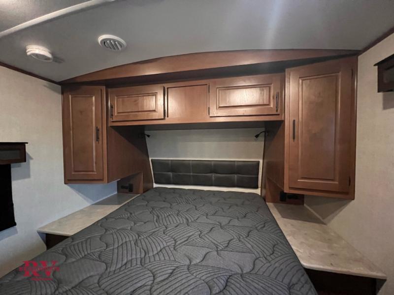 Head out to your favorite campsite in this roomy couple's trailer. There are dual entry doors, allowing you to enter in through the rear living area, or the front private bedroom. You can relax on the free-standing recliners after you've unpacked and maybe watch a show on the swing-out 32" TV. And an optional residential sofa with built-in recliners in place of the recliners is available here if you'd prefer that seating set up! Once lunch is prepared on the three burner cooktop, you can dine at the mountain dinette with a skylight, or head outdoors to sit under the 21' awning. The queen bed is sure to bring comfort in the front bedroom, and if you have an overnight guest, they can sleep on the dinette!