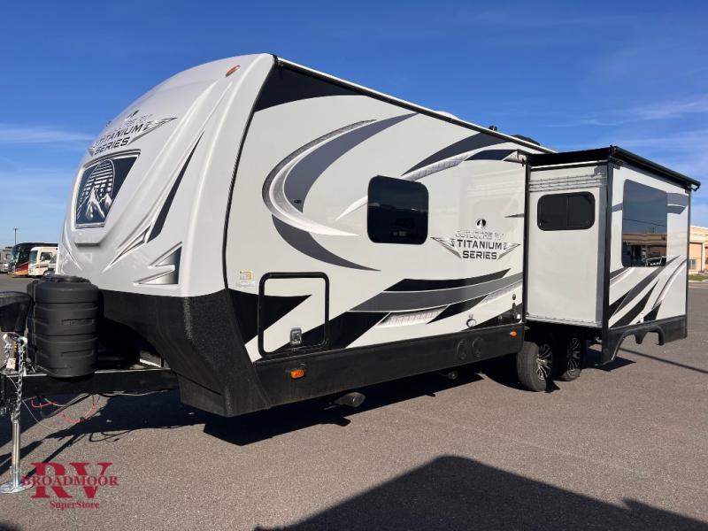 With any Timber Ridge Titanium Series travel trailer by Outdoors RV you will enjoy the sleek design frameless thermal pane windows, along with the silver fiberglass front cap and Titanium Series graphics package. The rugged 8' chassis with 5,100 lb. axles and XL ground clearance will make maneuvering tougher terrain easier than ever, and there is a wireless rear, side(s) turn camera system for hassle-free parking. Each model includes LG solid surface countertops, mountain lodge interiors, hardwood slide out fascia(s), and many more comforts!