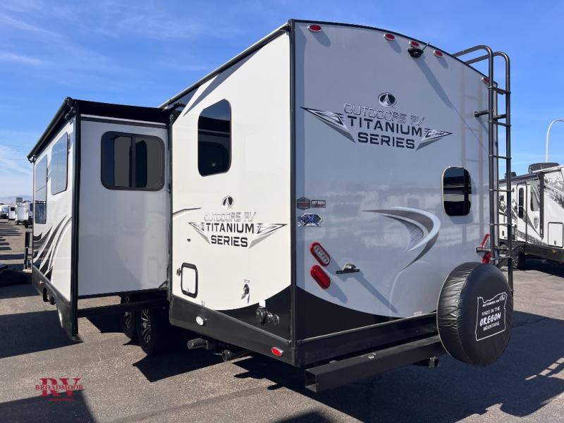 With any Timber Ridge Titanium Series travel trailer by Outdoors RV you will enjoy the sleek design frameless thermal pane windows, along with the silver fiberglass front cap and Titanium Series graphics package. The rugged 8' chassis with 5,100 lb. axles and XL ground clearance will make maneuvering tougher terrain easier than ever, and there is a wireless rear, side(s) turn camera system for hassle-free parking. Each model includes LG solid surface countertops, mountain lodge interiors, hardwood slide out fascia(s), and many more comforts!