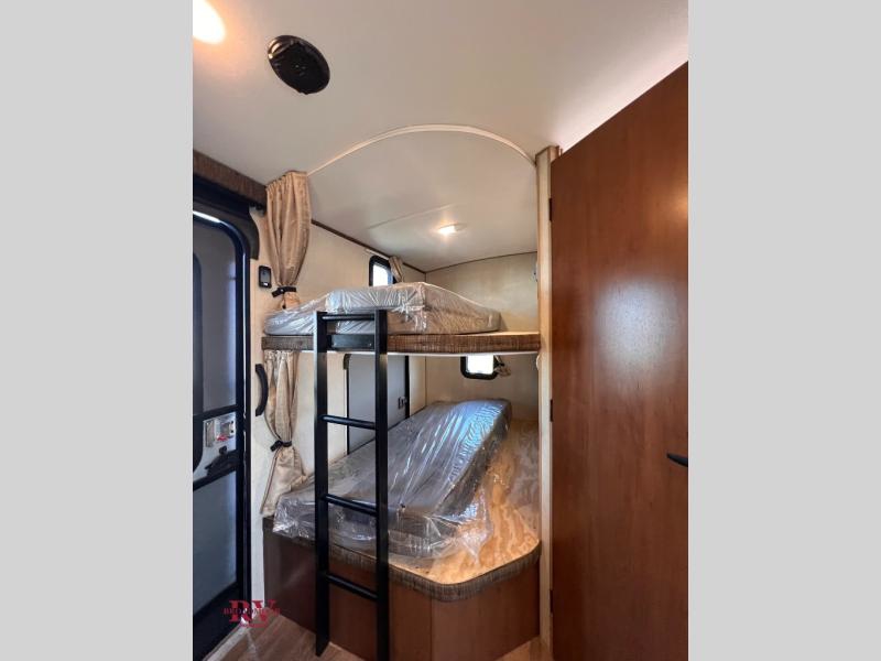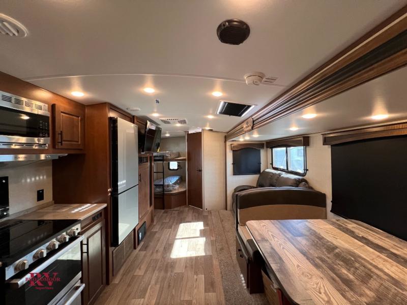 How does double-size bunks sound for your next camping trip? The kids are sure to love them, while you enjoy the queen bed in the front bedroom. There is a garage storage door that will be perfect for luggage, lawn chairs, and coolers, plus there is plenty of storage inside as well. The chef of your group will love cooking in the kitchen with its flip-up counter, three burner cooktop, and large pantry for dry goods. The large slide out in the main living area will provide space to let the dog rest on the floor, and your crew can get comfortable on the sleeper sofa or play a game at the mountain dinette.