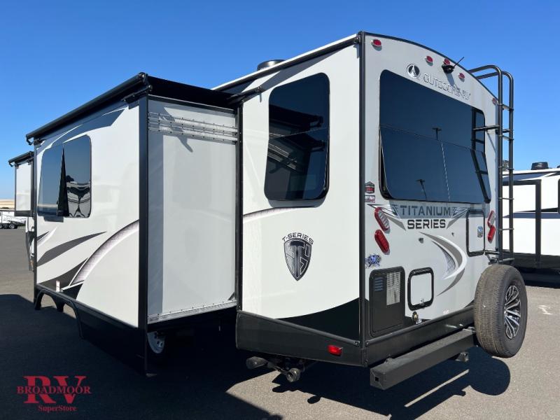 With any Black Stone Titanium Series travel trailer by Outdoors RV you will enjoy the sleek design frameless thermal pane windows, along with the silver fiberglass front cap and Titanium Series graphics package. The rugged 8' chassis with 5,200 lb. axles and XL ground clearance will make maneuvering tougher terrain easier than ever, and there is a ground control TT auto leveling system for hassle-free set-up. Each model includes LG solid surface countertops, mountain lodge interiors, hardwood slide out fascia(s), and many more comforts!