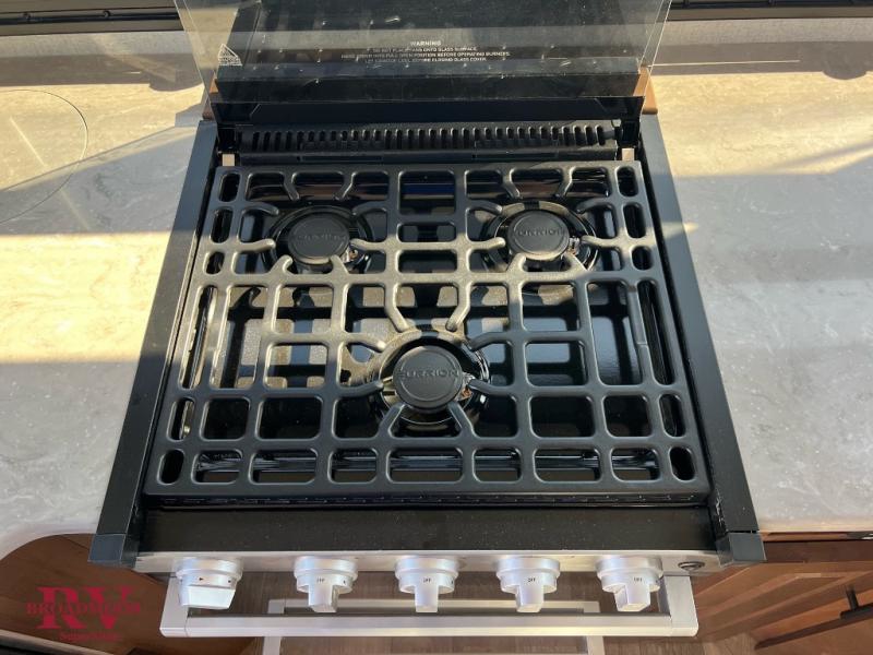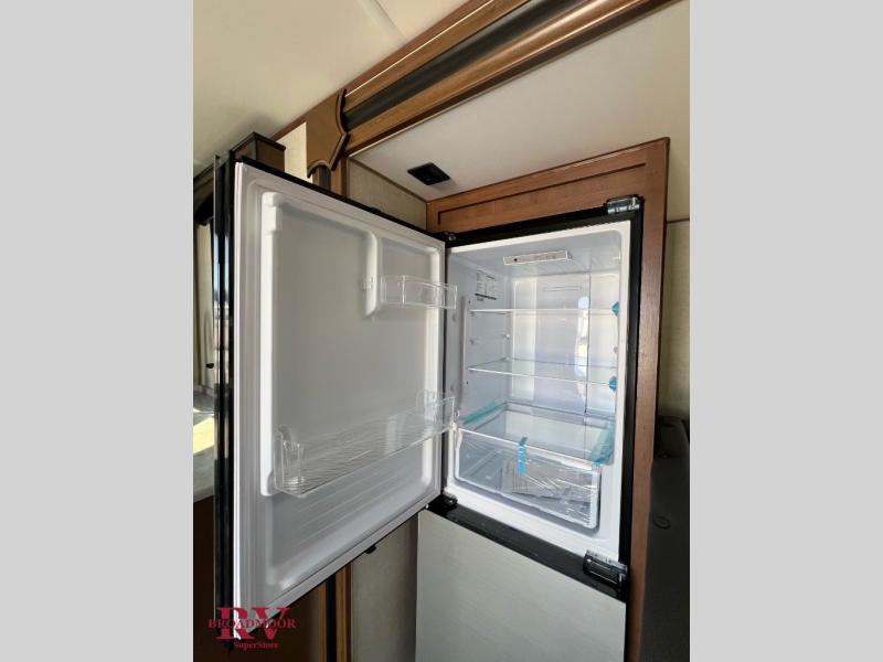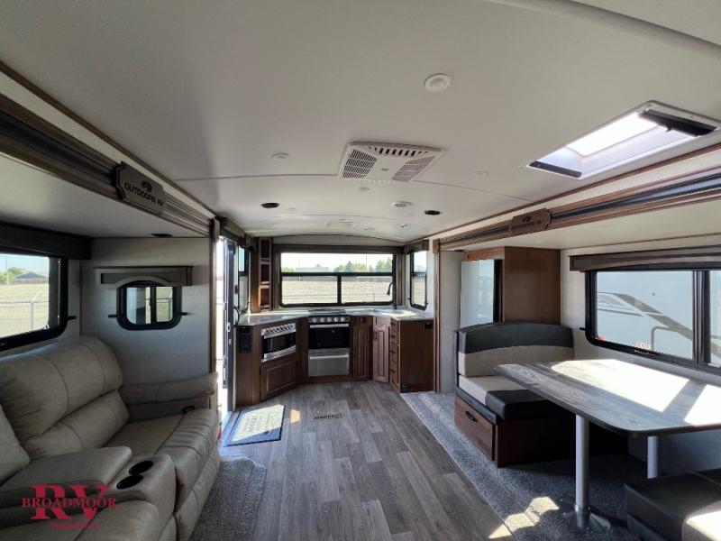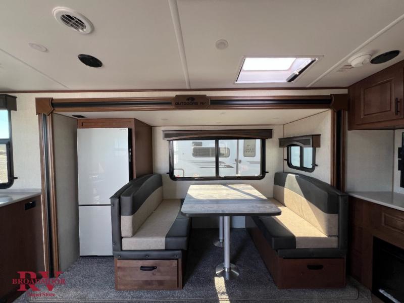 Dual entry doors in this travel trailer will allow you to enter in through the rear kitchen or the front master bedroom. A walk-through bath is easily accessible for everyone, and the main living area is made open thanks to the dual opposing slides. While dinner is being made on the three burner cooktop, you can play a game at the mountain dinette, or relax on the sofa with built-in recliners and watch a movie on the swing-out 40" TV. You'll appreciate plenty of storage space in this model, including a pantry, wardrobes on either side of the bed, plus a wardrobe slide in the bedroom for your favorite outfits!