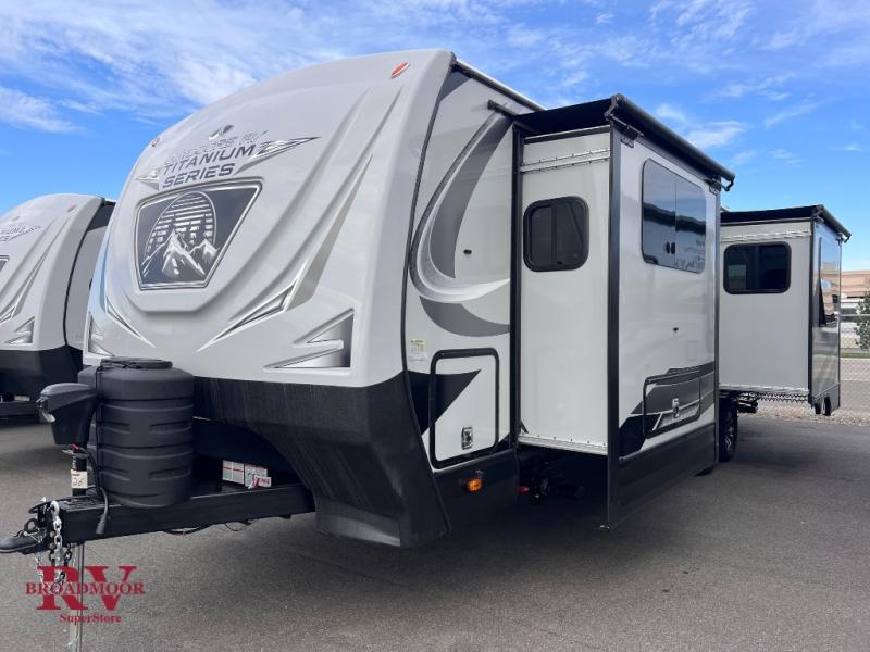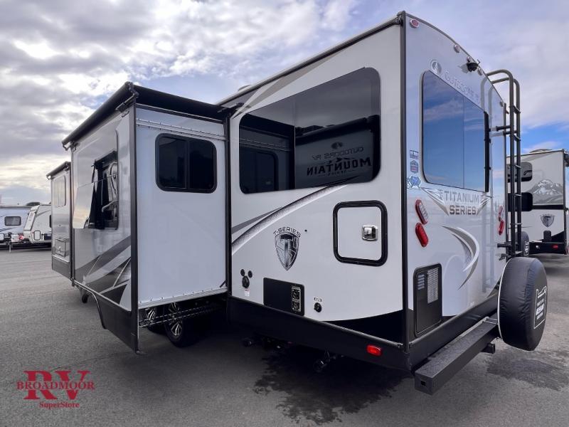 With any Black Stone Titanium Series travel trailer by Outdoors RV you will enjoy the sleek design frameless thermal pane windows, along with the silver fiberglass front cap and Titanium Series graphics package. The rugged 8' chassis with 5,200 lb. axles and XL ground clearance will make maneuvering tougher terrain easier than ever, and there is a ground control TT auto leveling system for hassle-free set-up. Each model includes LG solid surface countertops, mountain lodge interiors, hardwood slide out fascia(s), and many more comforts!