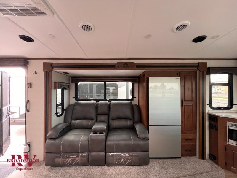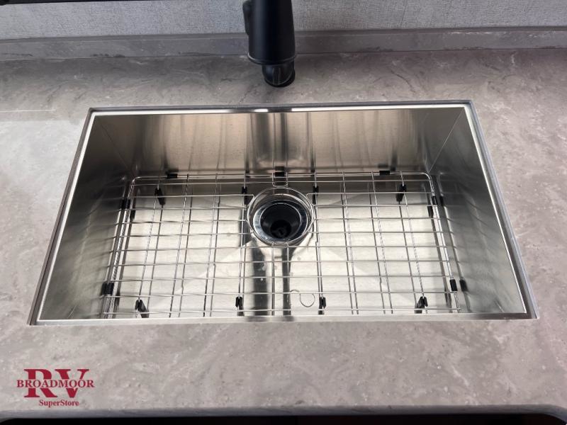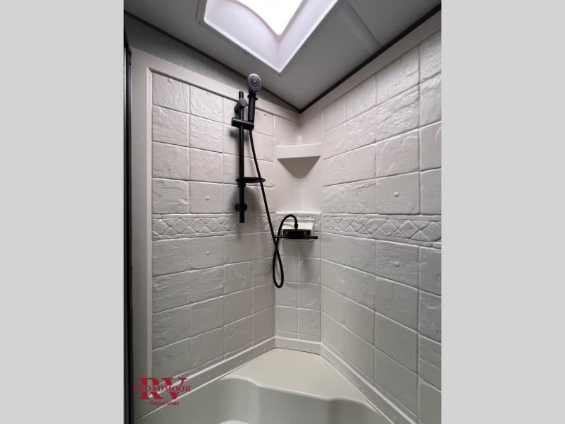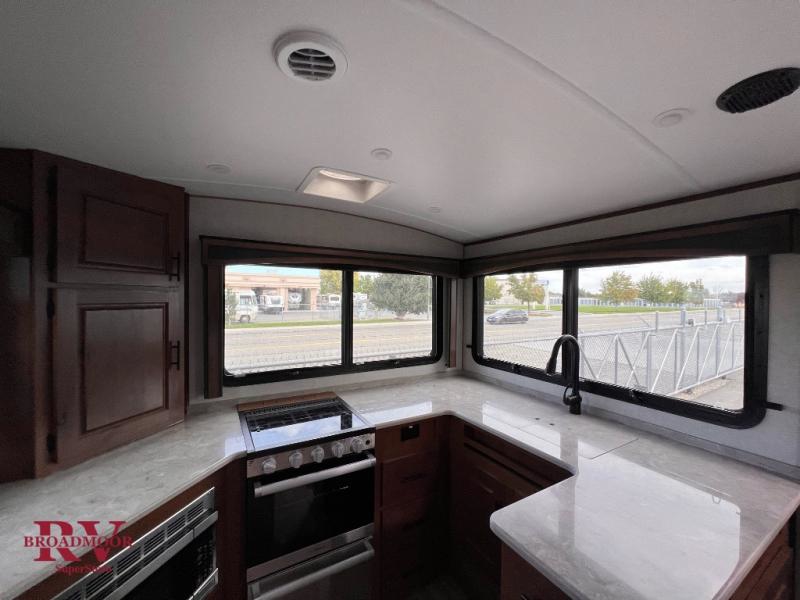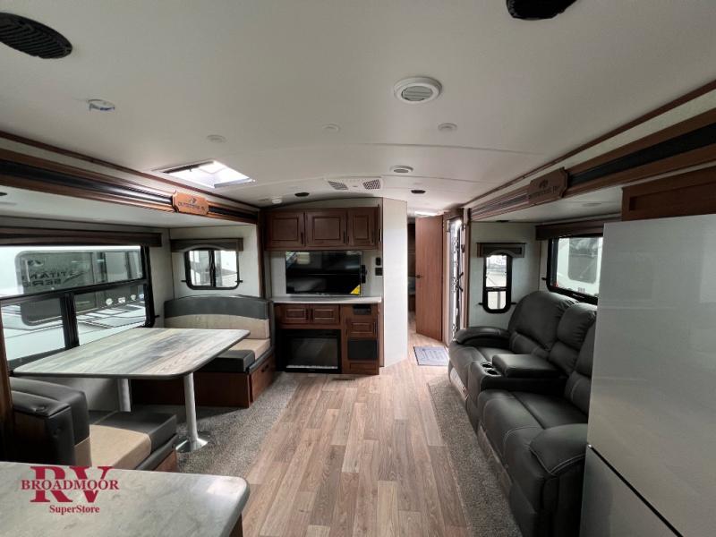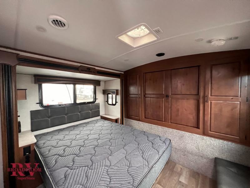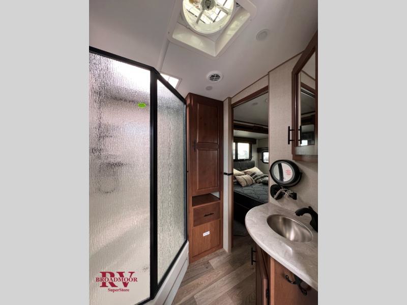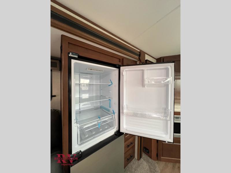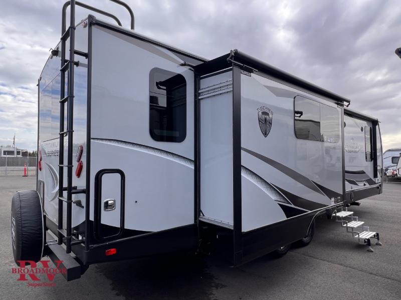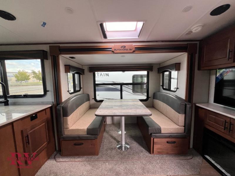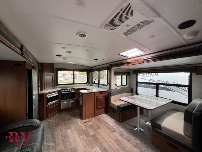 One step inside this roomy travel trailer and you'll be hooked! Your crew will love to visit in the main living area that includes dual opposing slides for tons of space, and there is a residential sofa with built-in recliners here to relax. The mountain dinette with a skylight will be the perfect place for a game of cards, and don't overlook the swing-out 40" TV here as well. This model has abundant counter space in the rear kitchen and plenty of windows to take in the outdoor views as you cook. A dual entry bath is super convenient to have, and the front master bedroom will have you feeling right at home. Here, you'll find a queen bed slide out, a large front closet, plus a bench hamper to keep your space tidy.