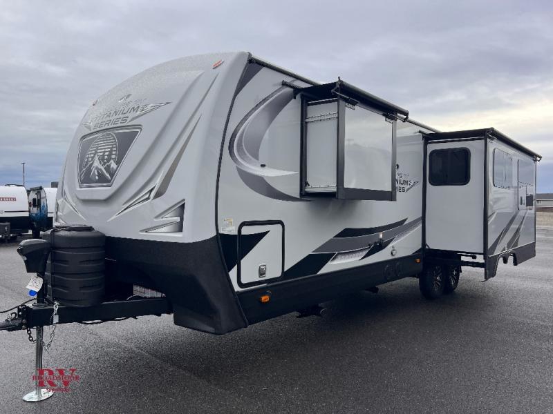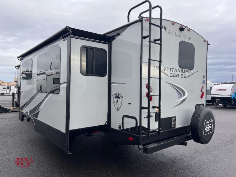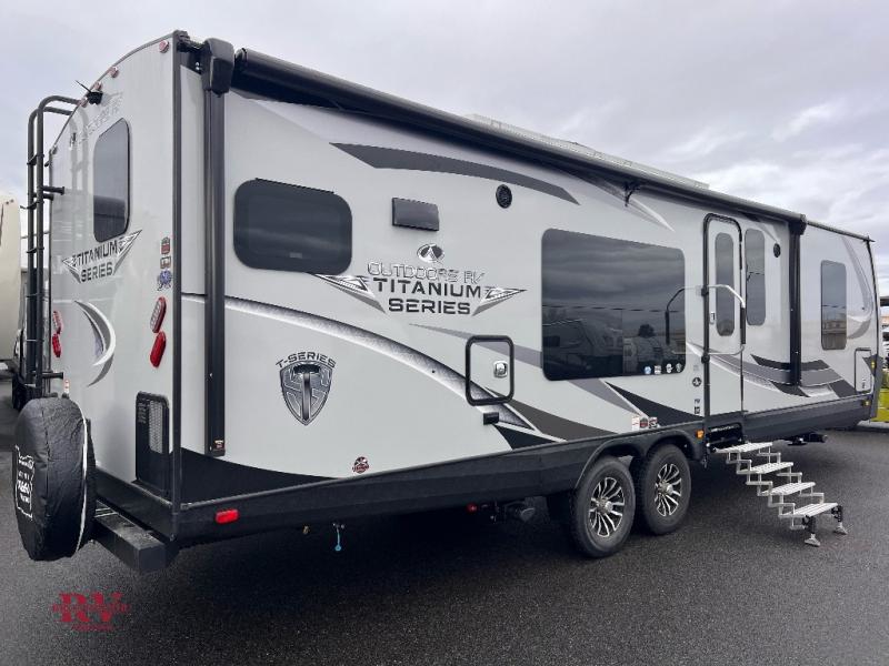 With any Black Stone Titanium Series travel trailer by Outdoors RV you will enjoy the sleek design frameless thermal pane windows, along with the silver fiberglass front cap and Titanium Series graphics package. The rugged 8' chassis with 5,200 lb. axles and XL ground clearance will make maneuvering tougher terrain easier than ever, and there is a ground control TT auto leveling system for hassle-free set-up. Each model includes LG solid surface countertops, mountain lodge interiors, hardwood slide out fascia(s), and many more comforts!