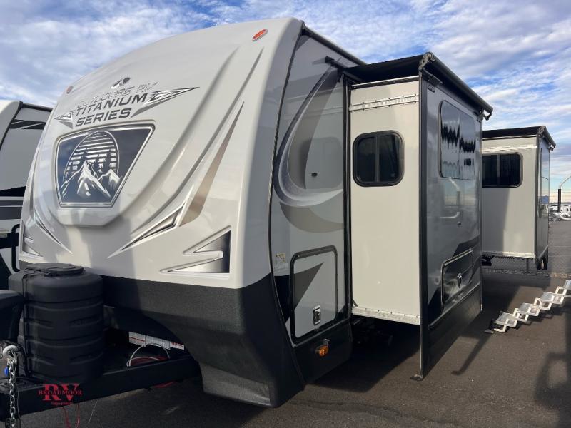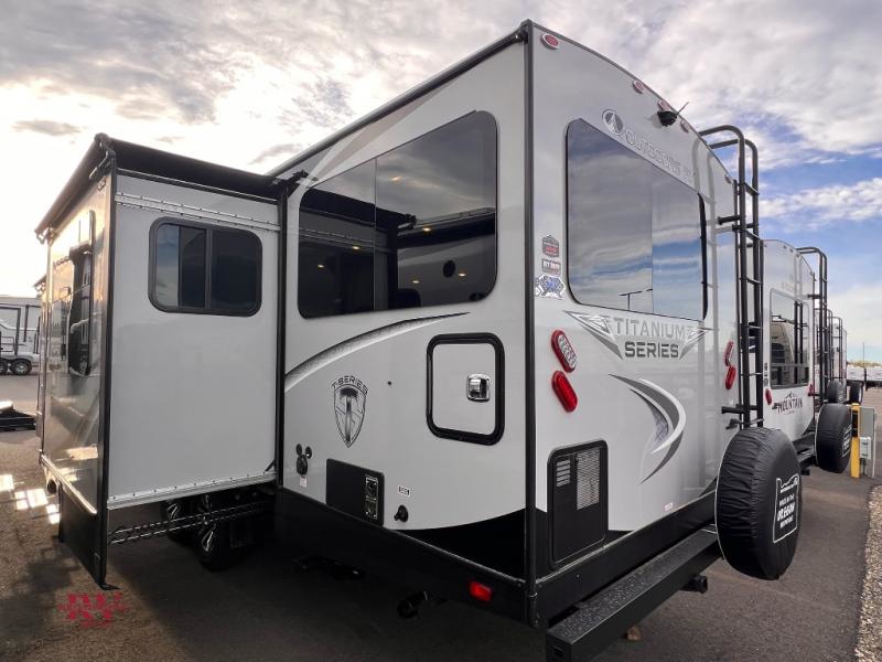With any Black Stone Titanium Series travel trailer by Outdoors RV you will enjoy the sleek design frameless thermal pane windows, along with the silver fiberglass front cap and Titanium Series graphics package. The rugged 8' chassis with 5,200 lb. axles and XL ground clearance will make maneuvering tougher terrain easier than ever, and there is a ground control TT auto leveling system for hassle-free set-up. Each model includes LG solid surface countertops, mountain lodge interiors, hardwood slide out fascia(s), and many more comforts!