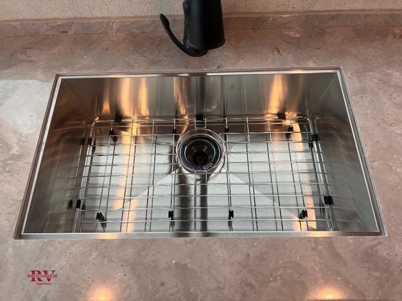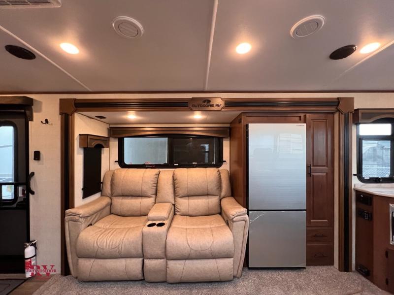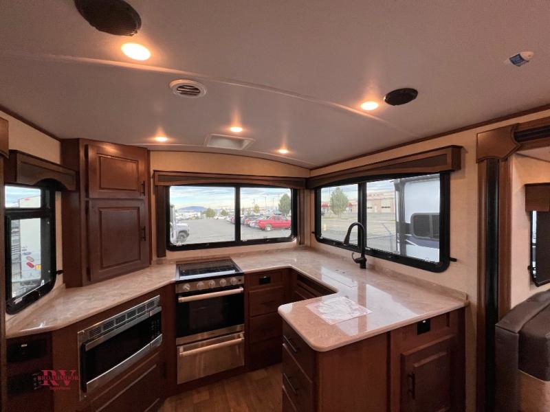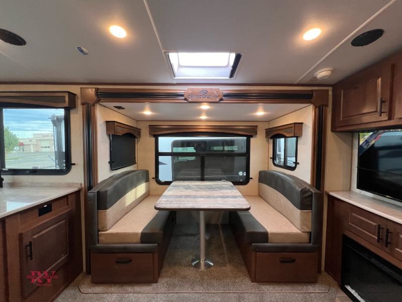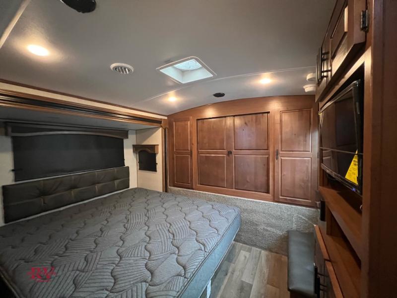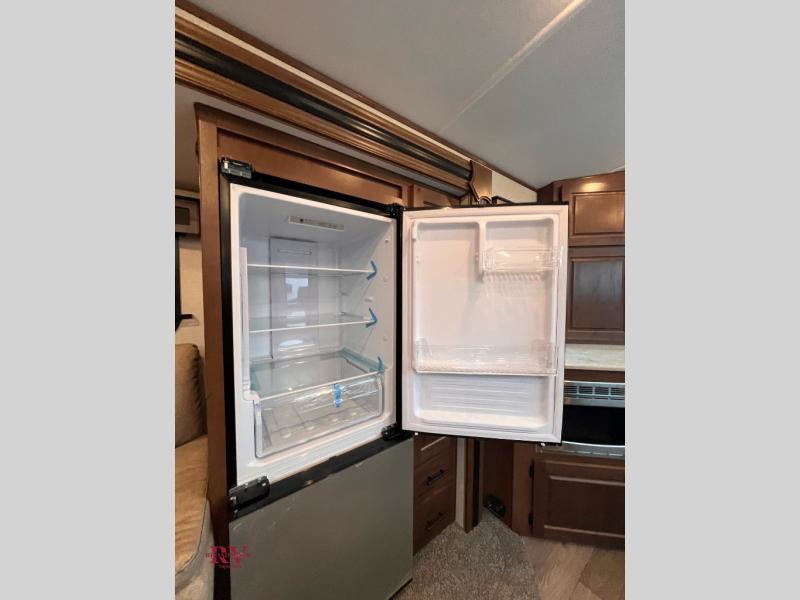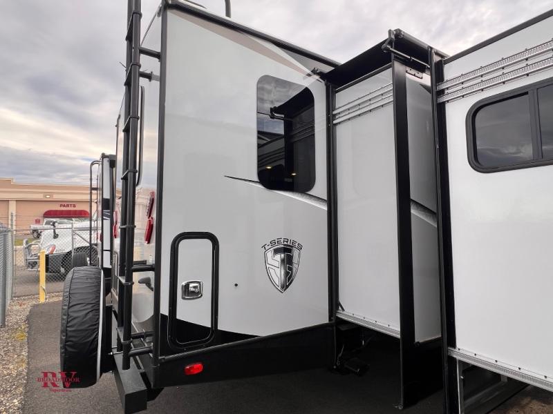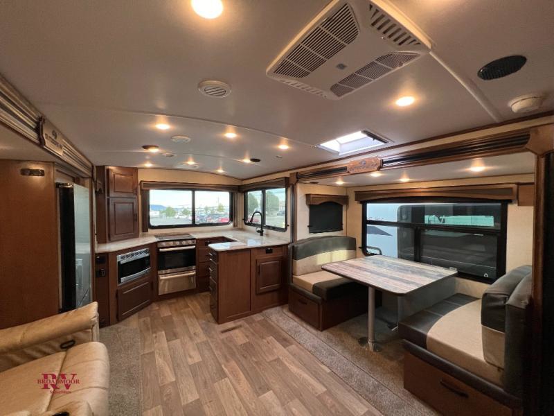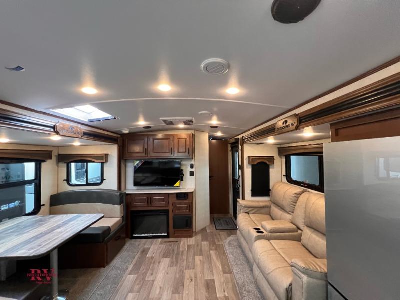 One step inside this roomy travel trailer and you'll be hooked! Your crew will love to visit in the main living area that includes dual opposing slides for tons of space, and there is a residential sofa with built-in recliners here to relax. The mountain dinette with a skylight will be the perfect place for a game of cards, and don't overlook the swing-out 40" TV here as well. This model has abundant counter space in the rear kitchen and plenty of windows to take in the outdoor views as you cook. A dual entry bath is super convenient to have, and the front master bedroom will have you feeling right at home. Here, you'll find a queen bed slide out, a large front closet, plus a bench hamper to keep your space tidy.