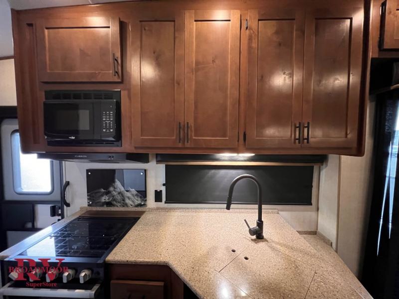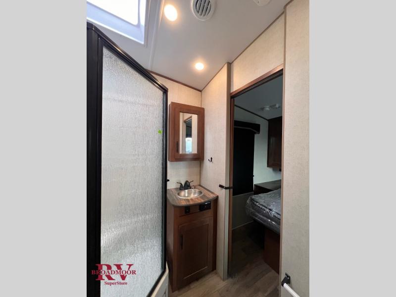 You'll feel right at home in this spacious travel trailer for three to four! Once you've set up the 20' awning, you can enjoy the 83" x 94" patio deck with residential sliding glass doors, a rail kit plus stairs. Head inside to make lunch on the cooktop, grab a cold drink from the 10 cu. ft. 12V refrigerator, and dine at the mountain dinette! There are also two easy glide TRX recliners where you can relax in the evenings with a good book. A dual entry bath gives you an entrance from the kitchen plus a private entrance into the front bedroom. There is a 60" x 80" queen bed and plenty of storage spaces for your shoes, clothes and personal belongings!