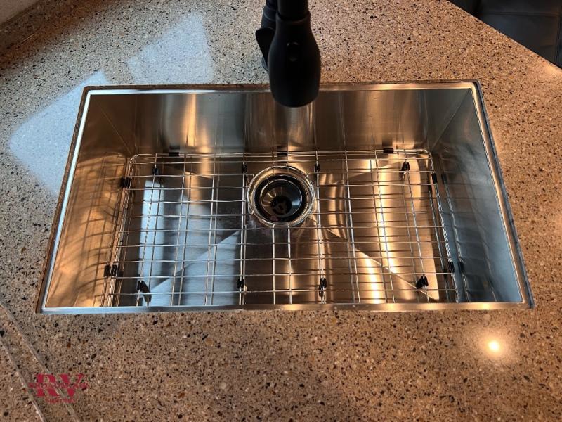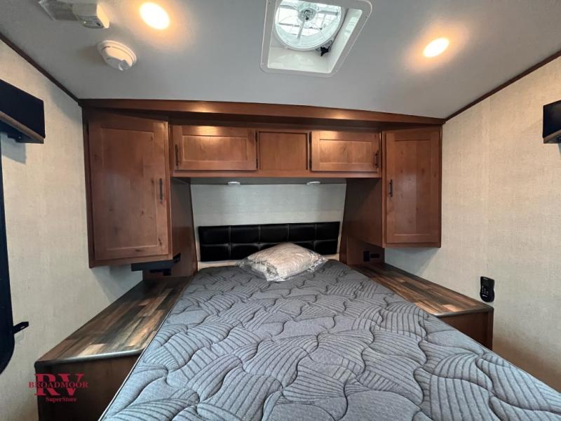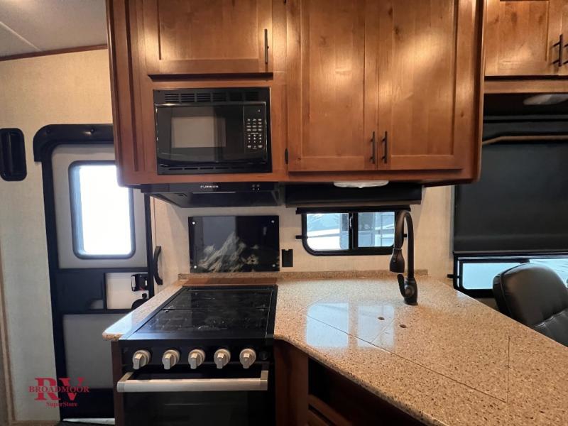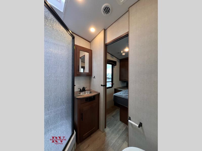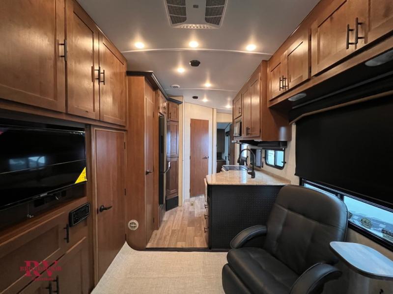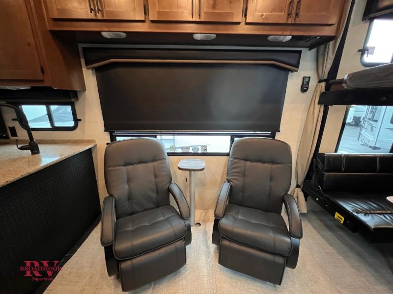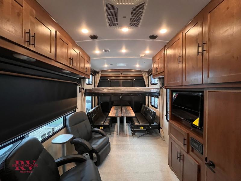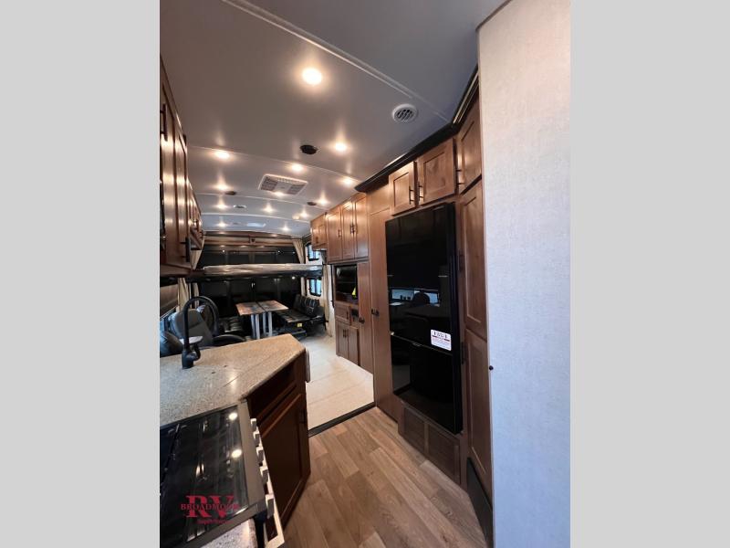 The kids will be begging you to go camping with this toy hauler! They can sleep on the loft queen bed in the 13' 4" garage area above dual opposing sofas with a table in between, and you can sleep comfortably in the front private bedroom with the queen bed. The bedroom also has an entrance into the dual entry bathroom which has a neo-angled shower with a skylight above for added natural lighting as you get ready. Keep everyone's bellies full with the fully equipped kitchen and entertained with the entertainment center that has a 32" swing out TV. Across from the entertainment center are two recliners to relax in each night too. The in-floor tool box makes life easier and the high pressure exterior spray washer is handy after trail riding through the mud!