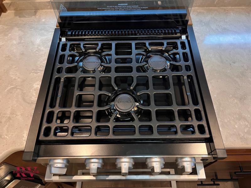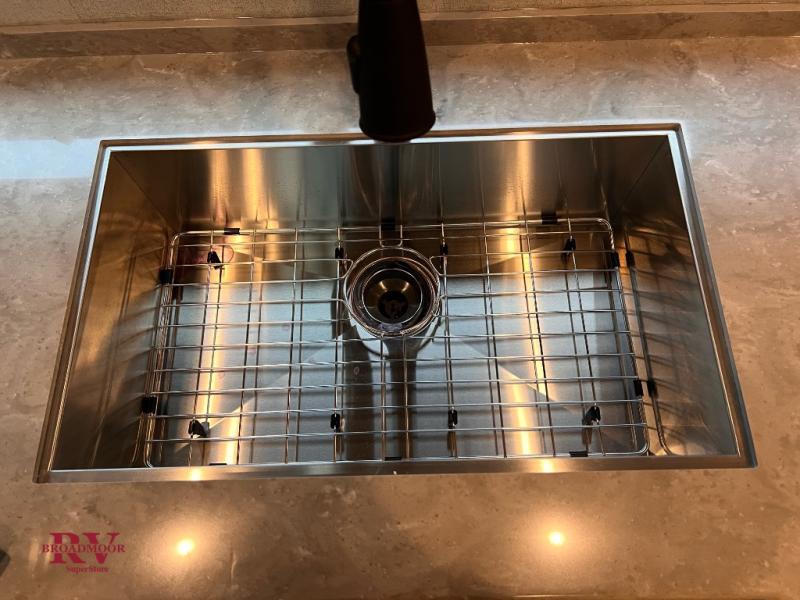 The cook will love this rear kitchen with the views out of the window and the U-shaped counter space to work from, plus having full amenities to make any type of meal. The pantry and refrigerator are next to the residential sofa within a slide out providing more interior floor space and a quick way to grab a snack before using the sofa built-in recliners to relax. There is another slide in this area with a mountain dinette, and both furnishings can provide extra sleeping space when needed. The entertainment center includes a swing-out 50" TV so everyone will have a good view. The front bedroom offers a queen bed to sleep on after a fun day outdoors, plus a wardrobe/linen slide giving both the bedroom and bathroom more space.