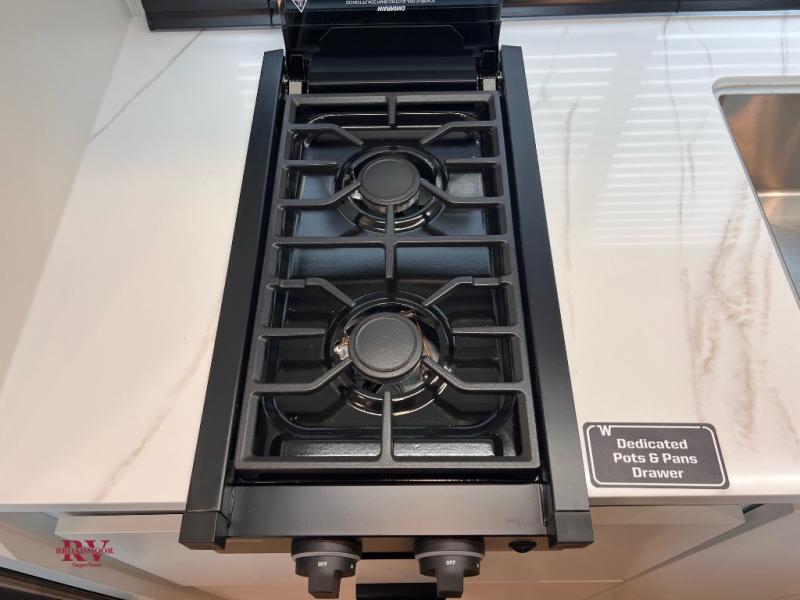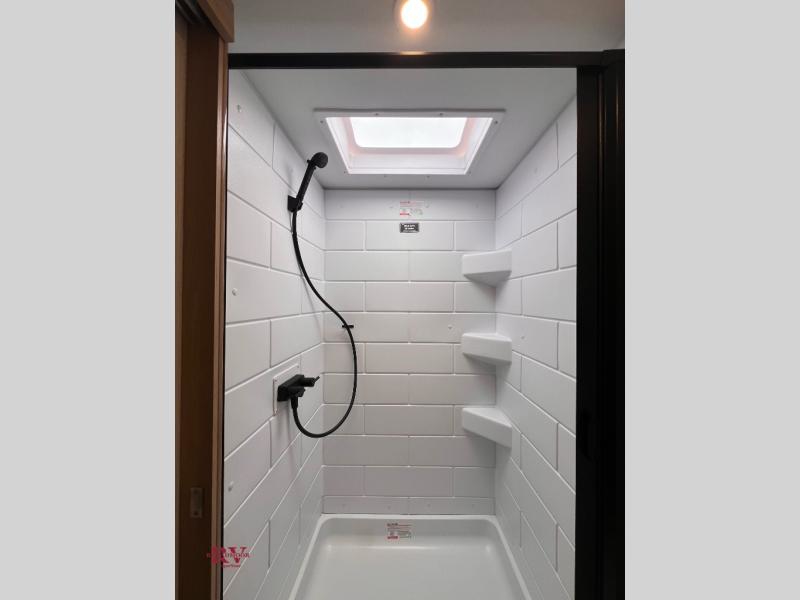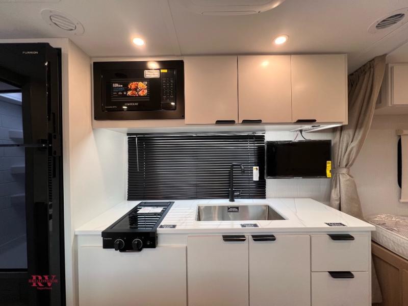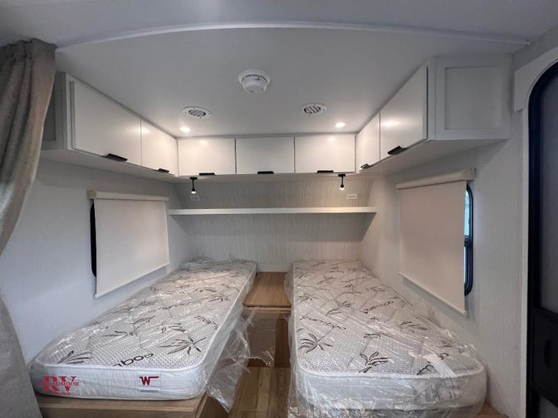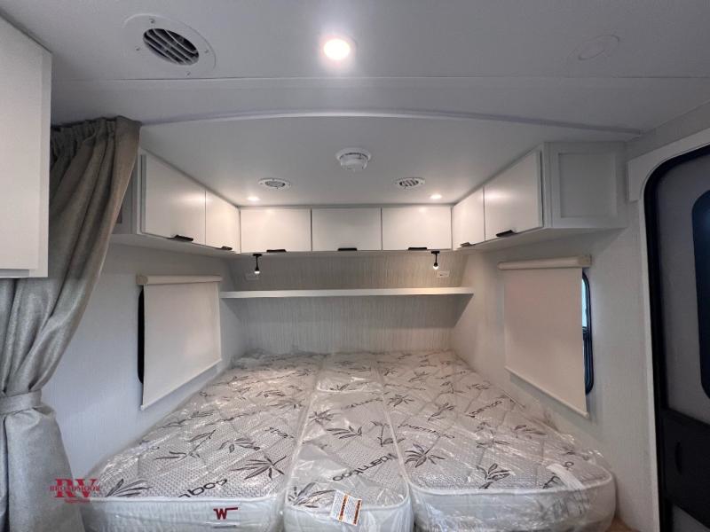 You'll love camping in this travel trailer with front twin beds and a divider curtain if you have a guest sleeping over on the booth dinette. You can whip up your best meals on the two-burner cooktop or in the convection microwave, and there is a 10-cu. ft. 12V refrigerator to keep your food fresh. A full rear bath will let you clean up after a day outdoors, and you'll appreciate the bath wardrobe/linen closet to keep clean towels and clothes close by!