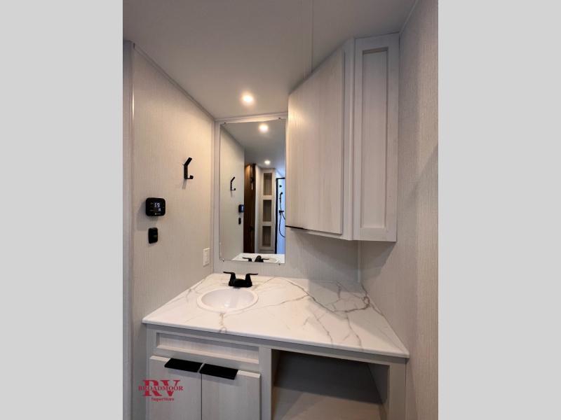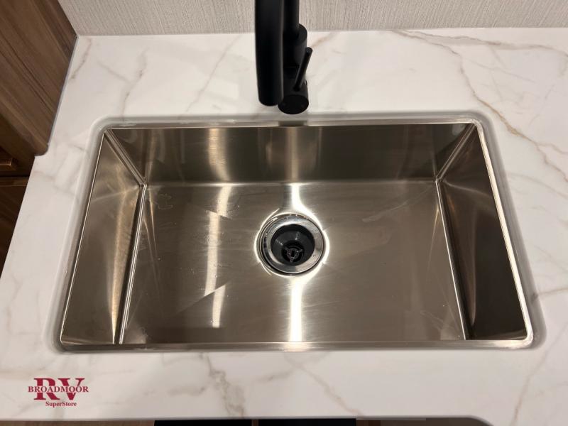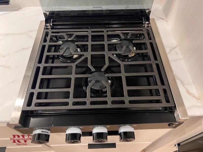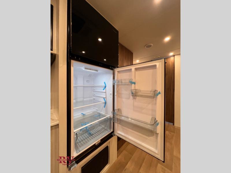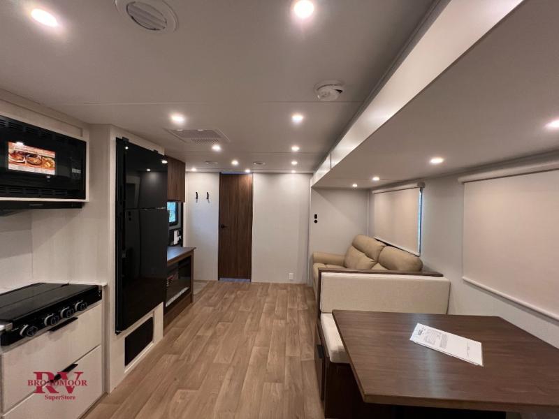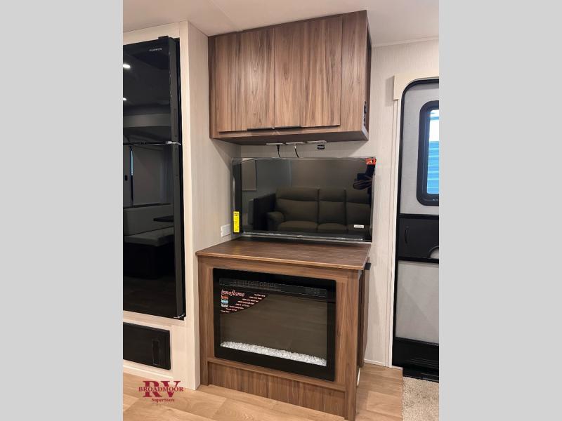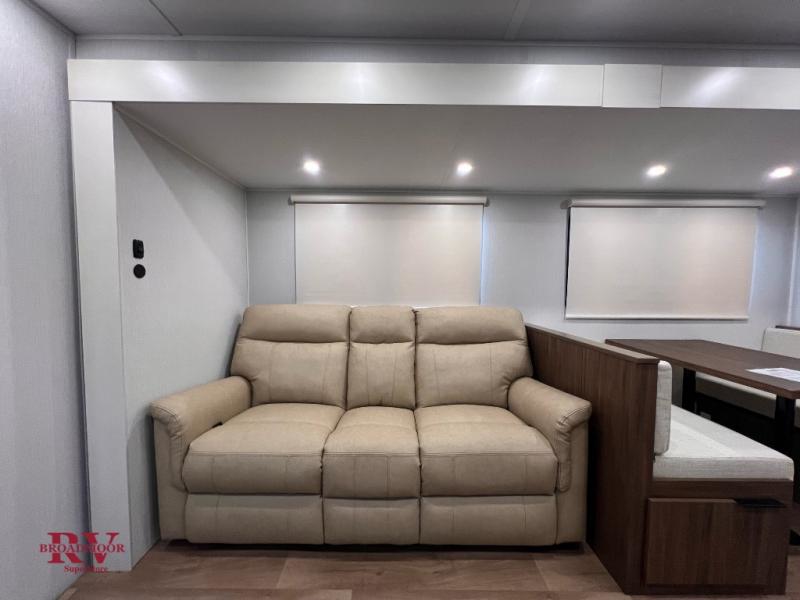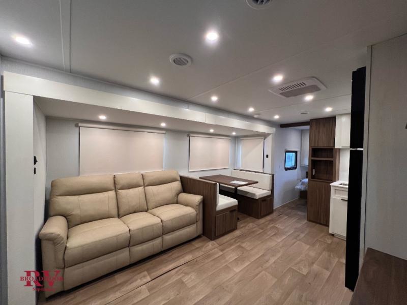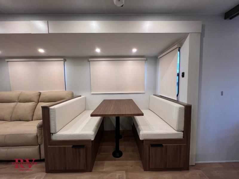 You'll feel right at home when you camp in this travel trailer! The large slide out gives you plenty of space to relax on the theater seating, play games at the booth dinette, and cook in the full kitchen. An adult or two little ones can sleep on the booth dinette at night, and if you're needing additional sleeping space, just choose the optional tri-fold sofa in place of the theater seating. You'll appreciate having the front private bedroom all to yourselves, complete with an Olympic queen bed, dual bedside wardrobes, and underbed storage. And don't overlook the full bath conveniently tucked in the back of the unit for added privacy!