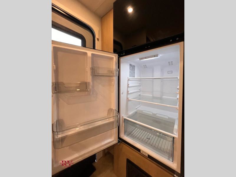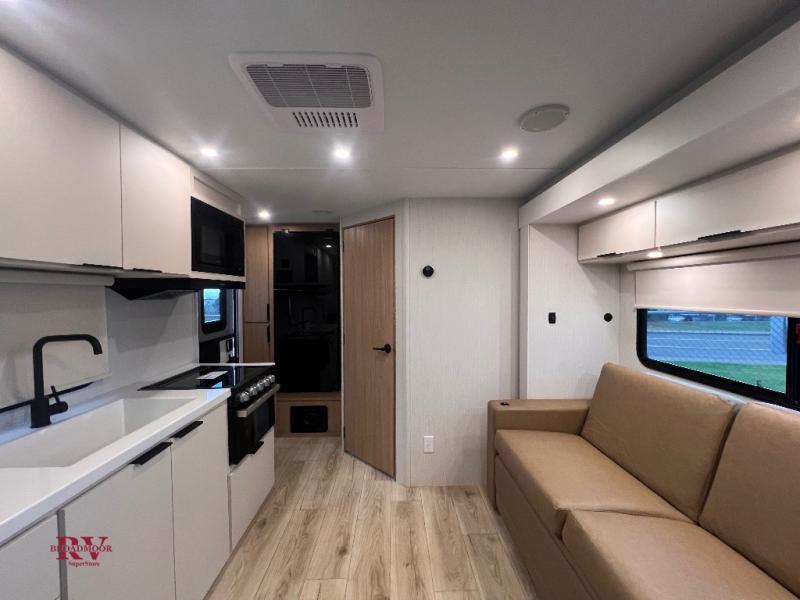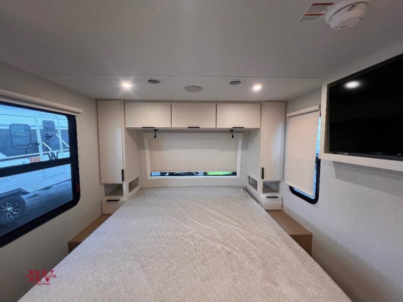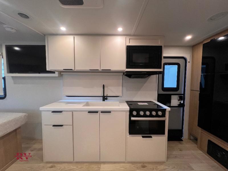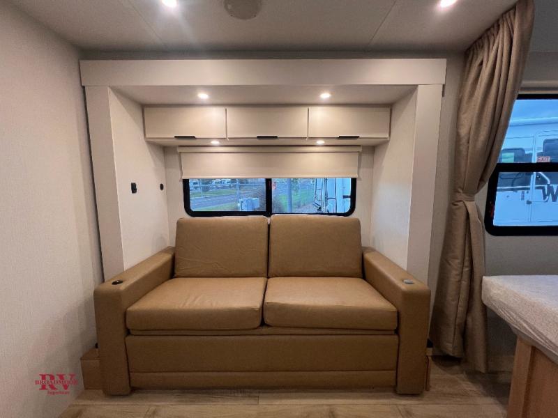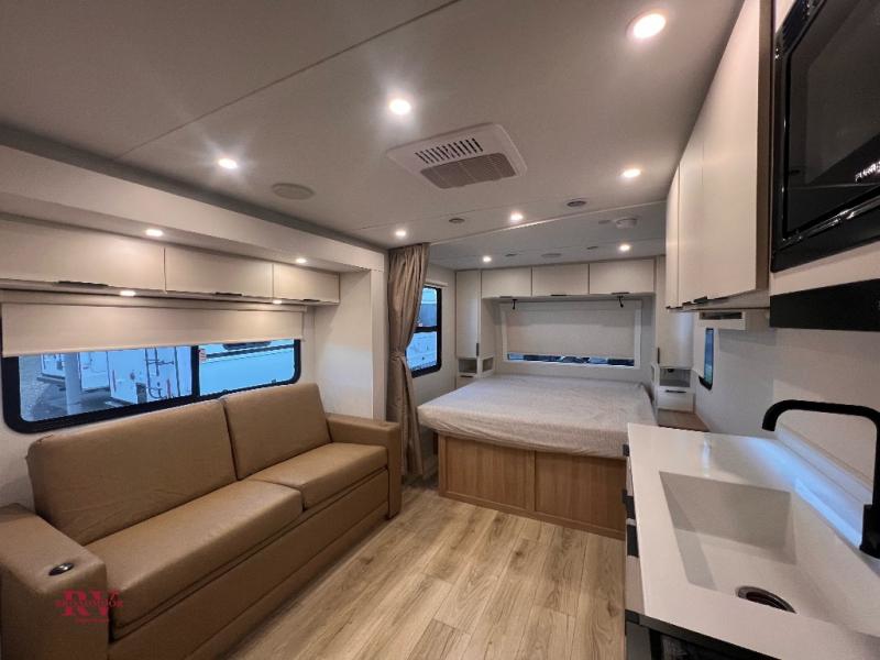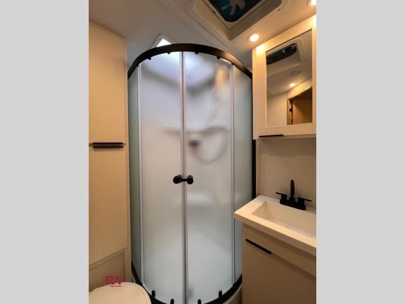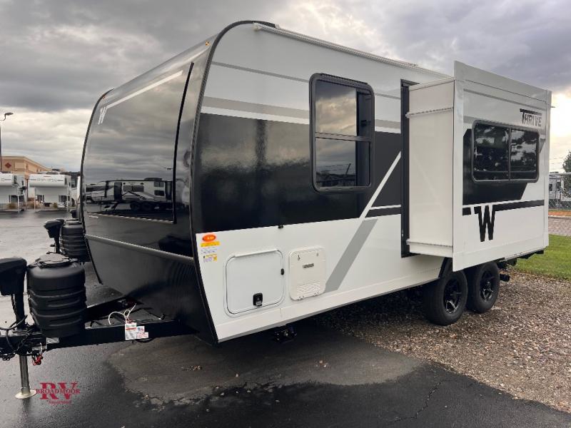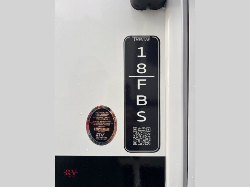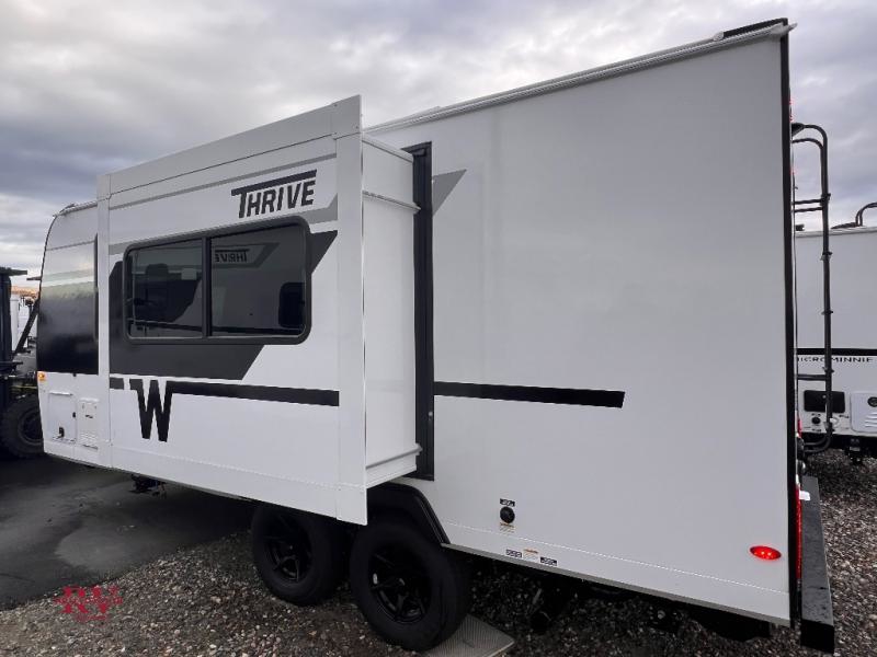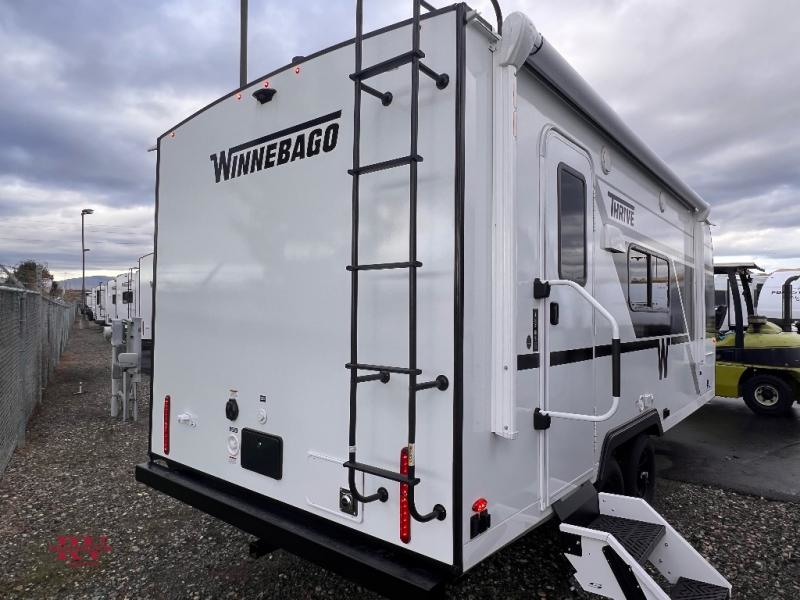 With any Thrive travel trailer by Winnebago, you can camp with functionality, comfort, and convenience! The large front viewing window will be the first thing that catches your eye, and the fiberglass sidewalls with Azdel Onboard provide a durable trailer made to last. There is also an exterior ladder, along with front radius profile lights, power stabilizer jacks, and a powered awning with LED lighting to name a few exterior features. You will stay powered up by the 30-amp power cord and 200-watt solar panel, plus there is a tankless water heater for endless hot showers. Inside, you'll love the custom Winnebago furniture, carpetless side outs, molded fiberglass countertops, and residential recessed ceiling lights to keep your space well lit!