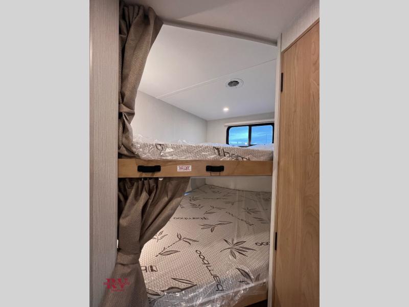 Your whole group will love camping in this travel trailer since there is a large slide out for more space and a sleeping capacity of ten! The front private bedroom includes a 66" x 80" Olympic queen bed, dual wardrobes, plus one of the dual entry doors to the unit for added convenience. Double-size bunks provide sleeping space for guests, along with the hide-a-bed sofa and U-shaped dinette within the slide out. The chef of your crew can make meals on the three-burner cooktop or in the microwave oven, and there is a flip-up counter extension to provide them with more counter space. This unit also includes a multi-functional space just as you enter the main living area, and the washer/dryer prep here gives you the option to add these appliances!